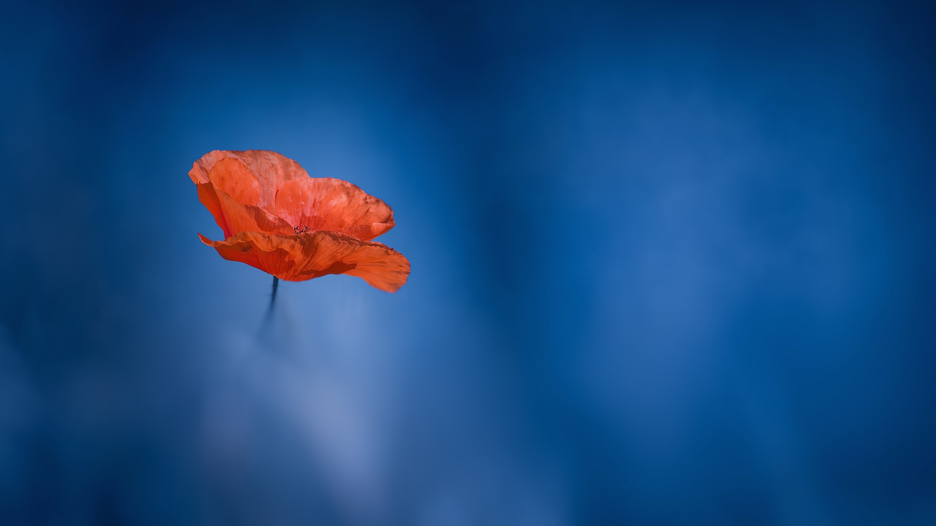 Description: A single orange flower is in the air with a blue background and a blurry background behind it.