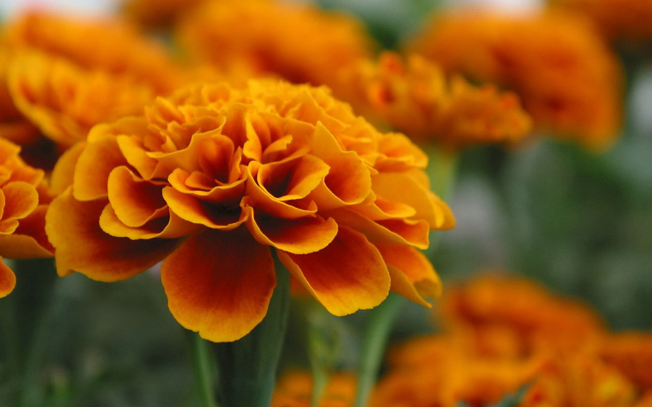 Description: A close up of a bunch of orange flowers with green leaves in the background and a blurry background.