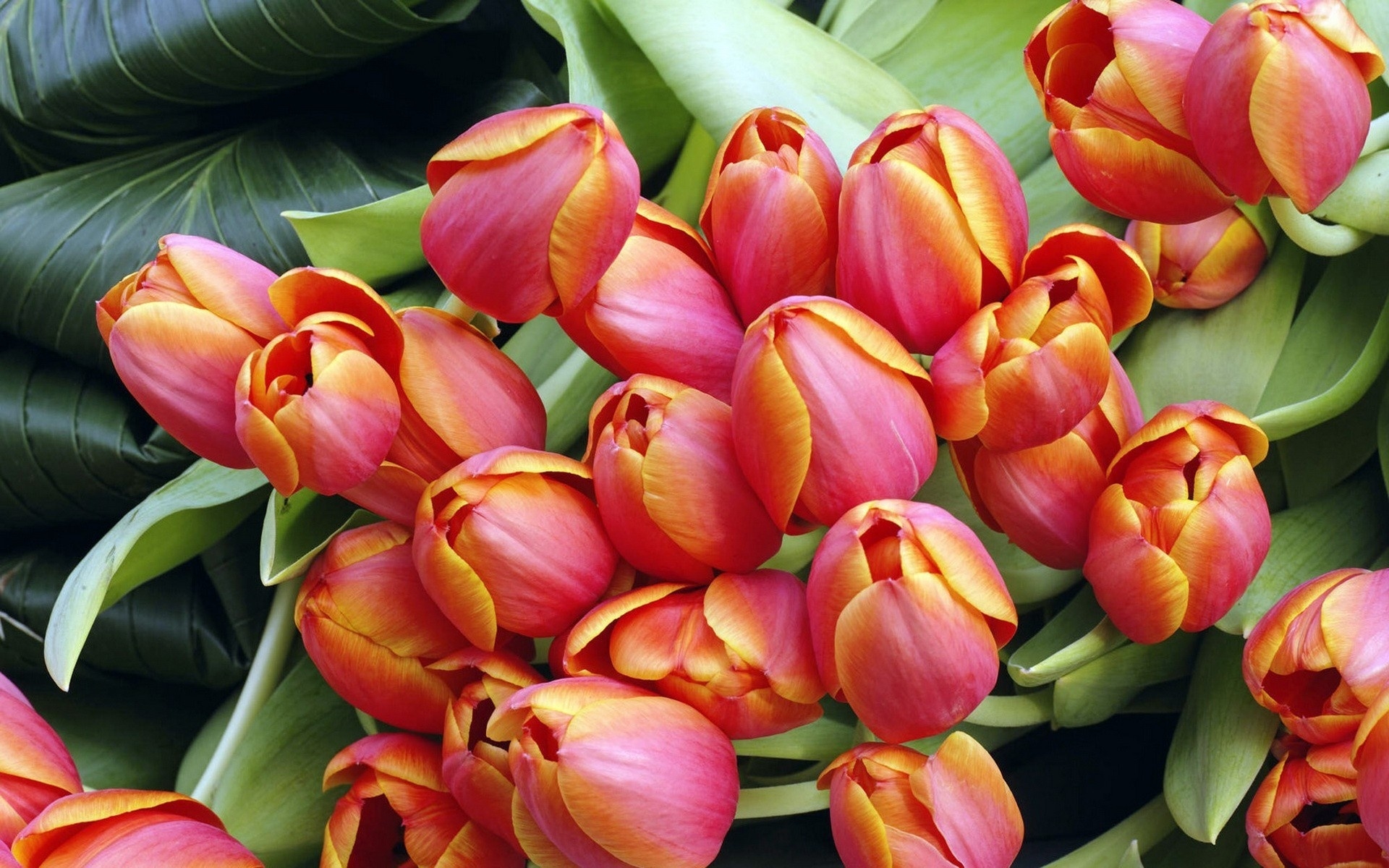 Description: A bunch of orange flowers with green leaves in the background and a bunch of green leaves in the foreground.