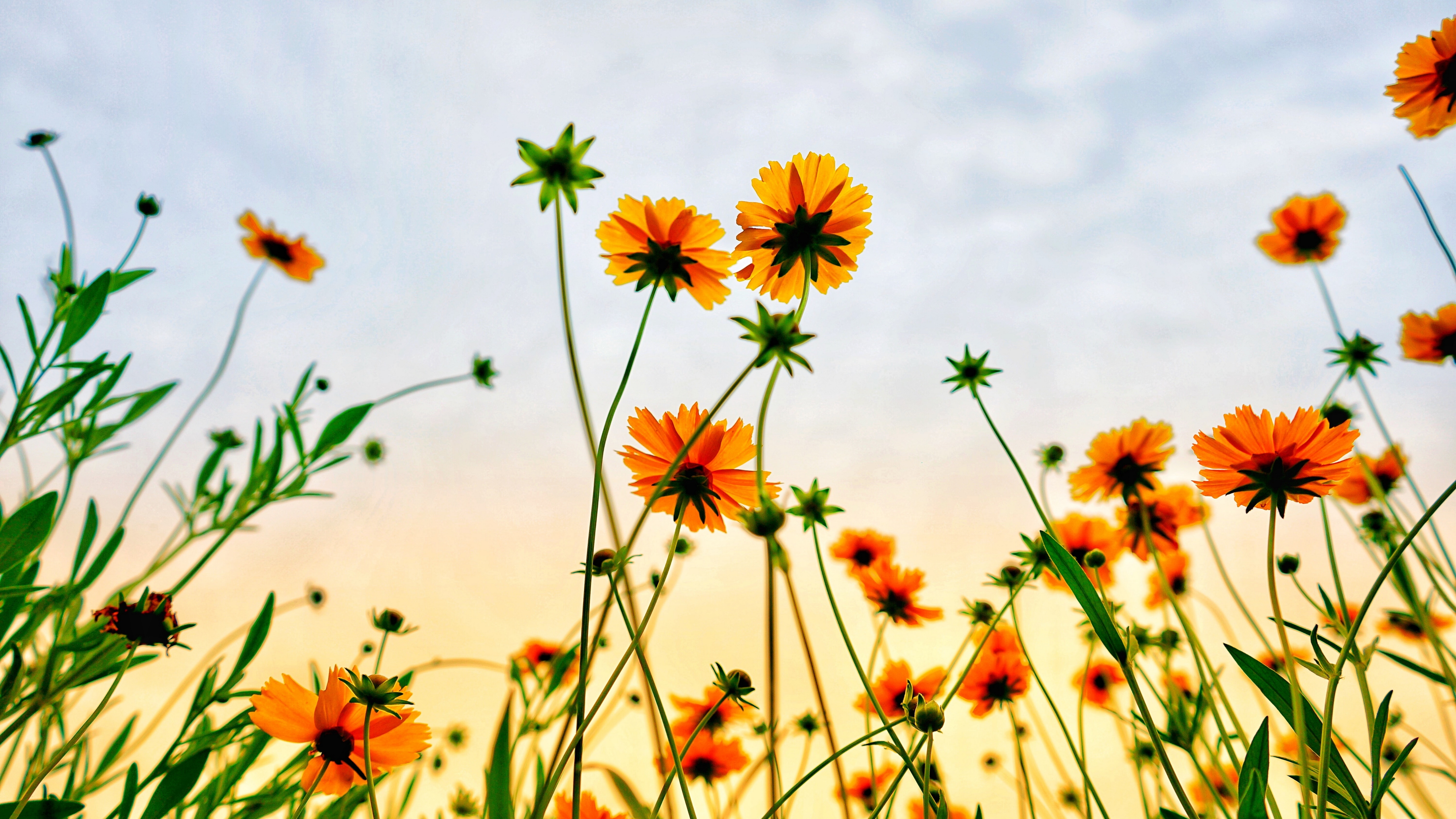 Description: A field of orange flowers with a sky background in the background with clouds in the sky and a few yellow flowers.