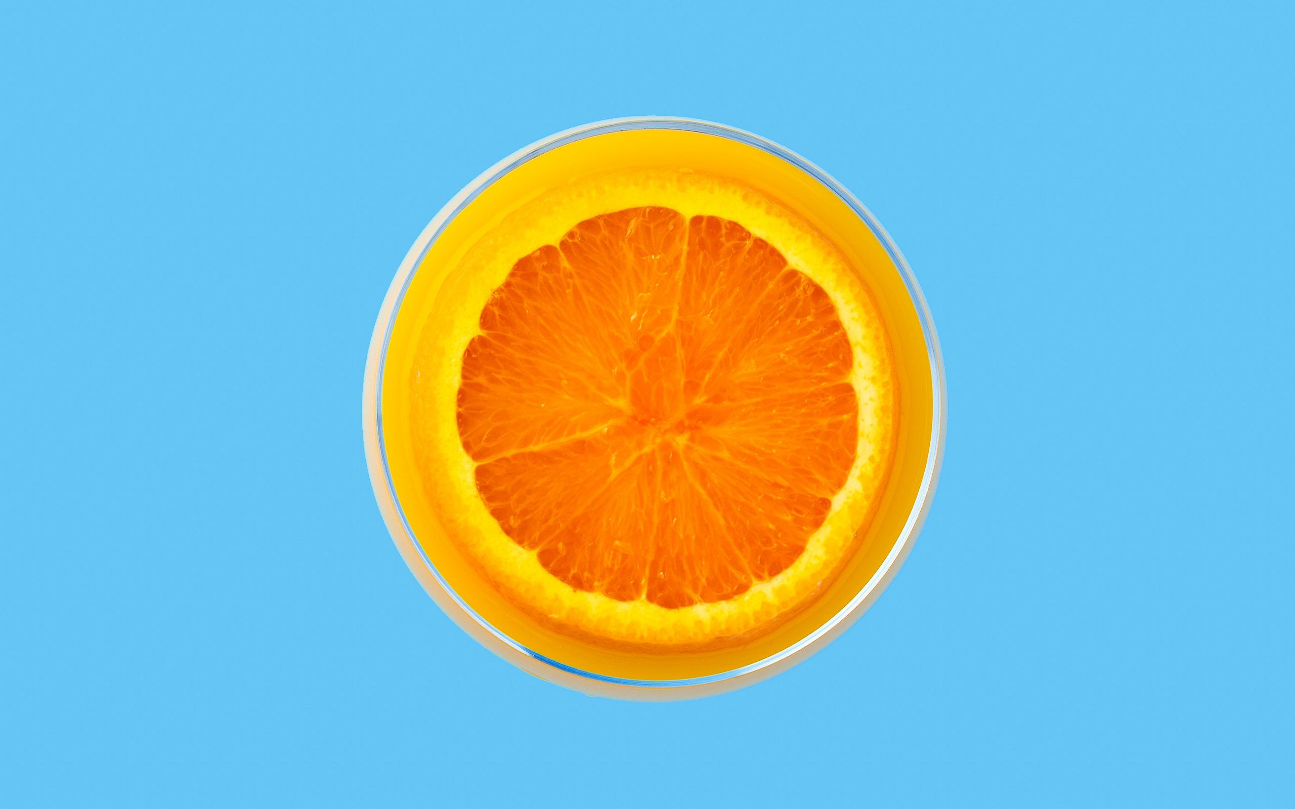 Description: A half of an orange is in a glass of water on a blue background with a reflection of the top of the glass.
