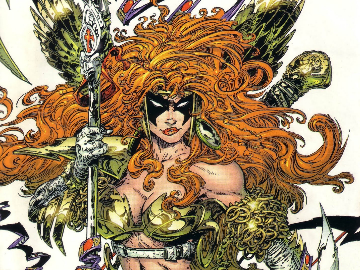 Description: A woman with orange hair and a sword in her hand and a demon face on her chest and a demon face on her chest.