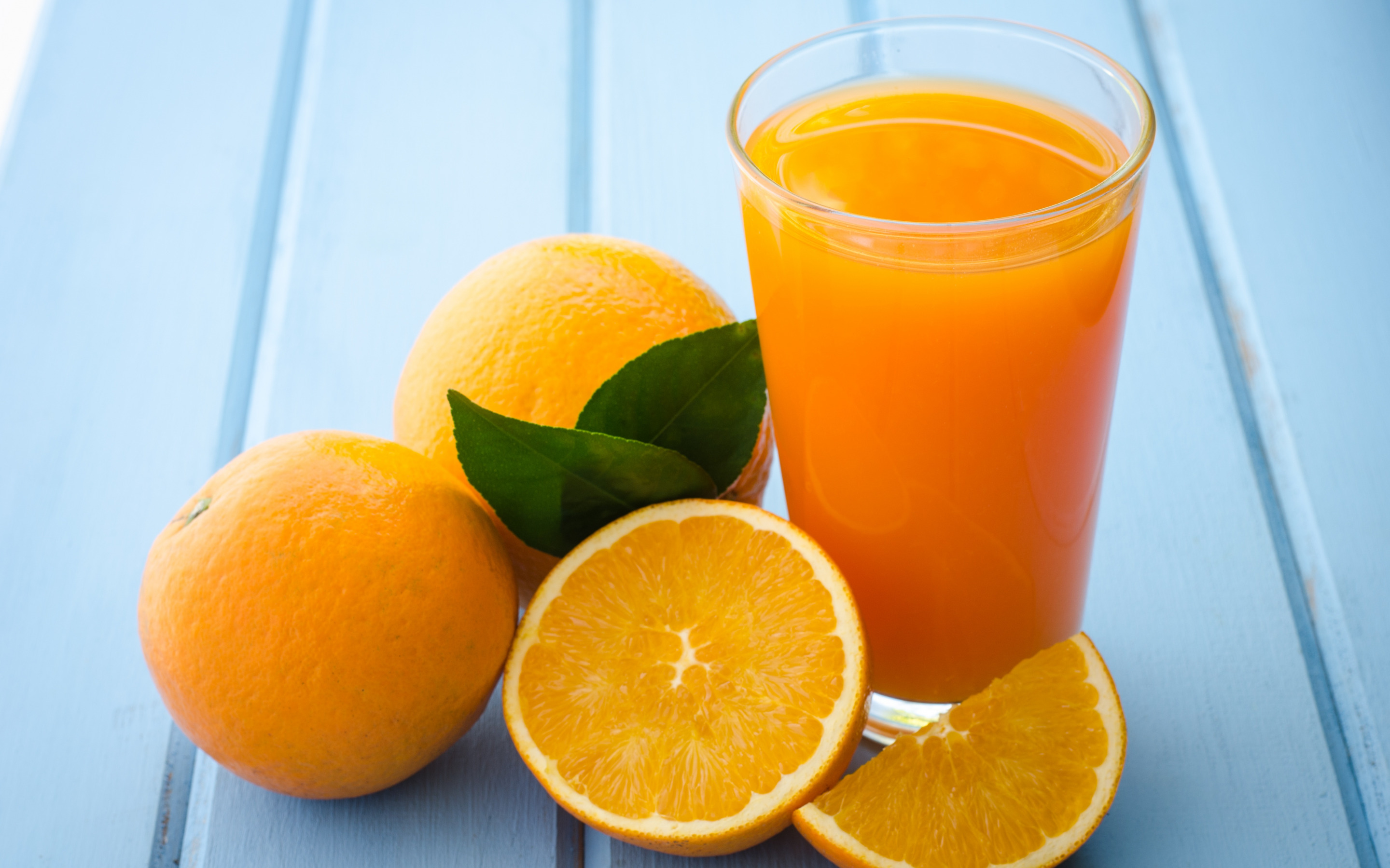 Description: A glass of orange juice next to some oranges on a table with leaves and a slice of orange.