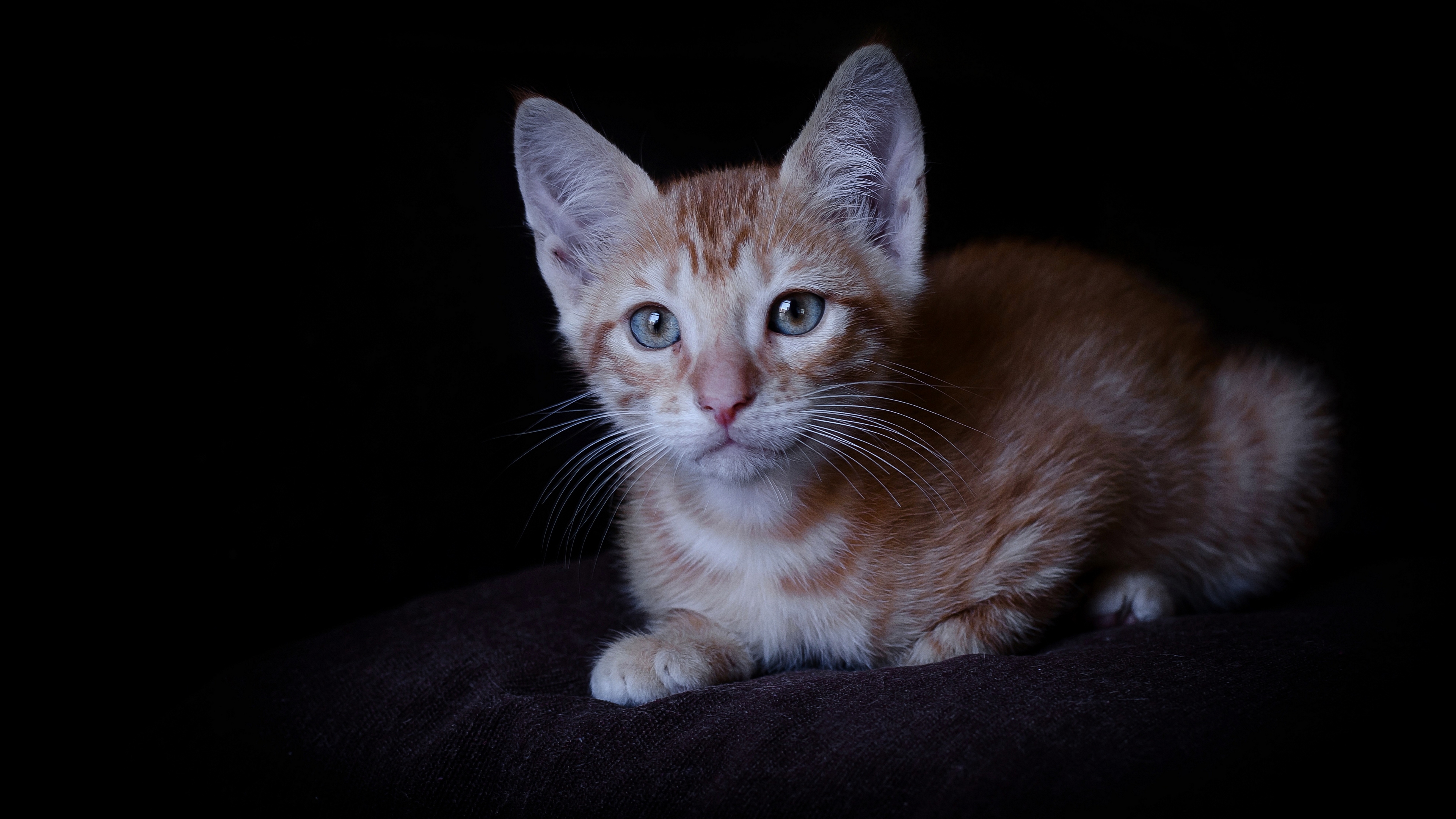 Description: A small orange kitten sitting on a black surface with a black background and a black background behind it.