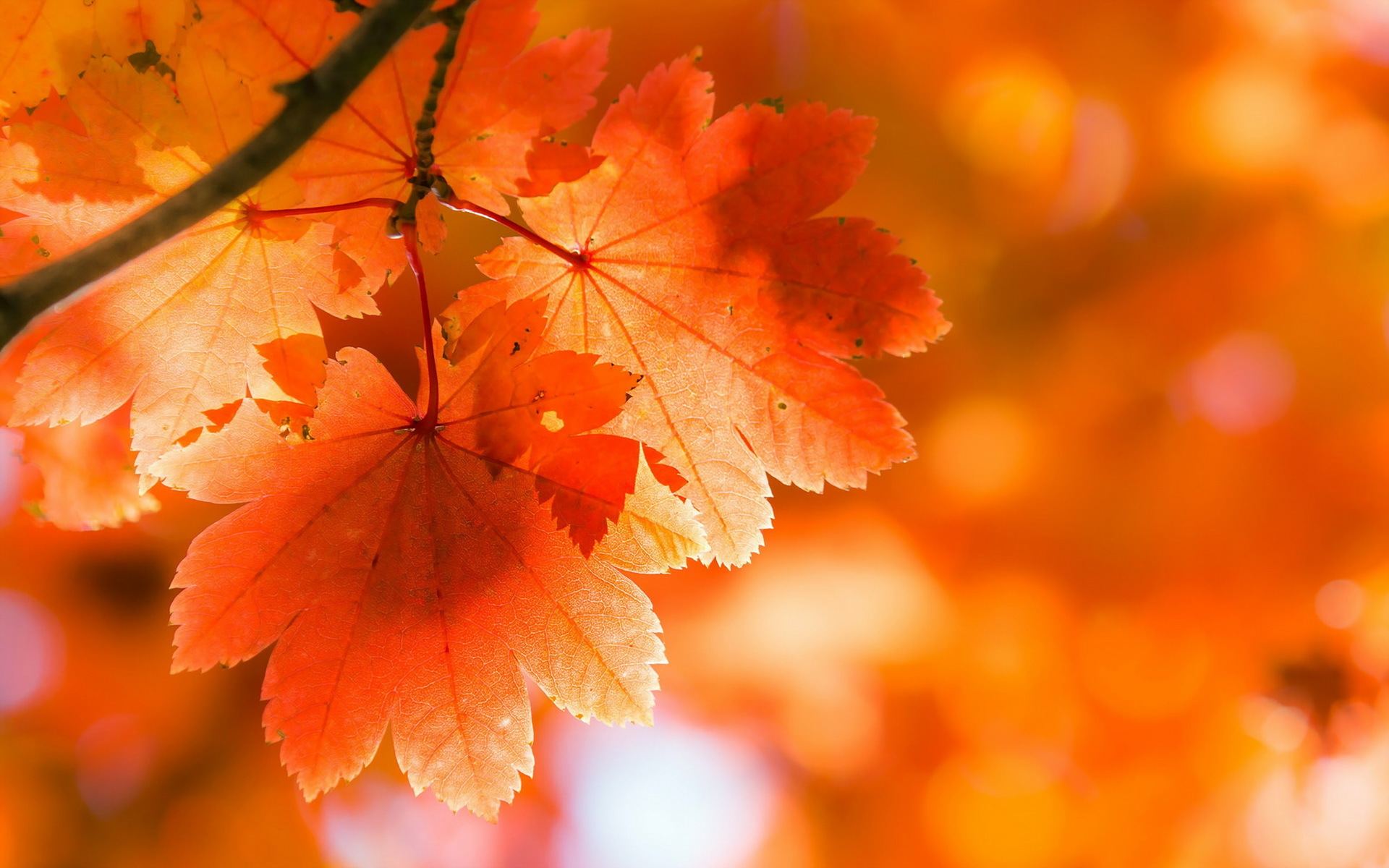 Description: A close up of a tree with orange leaves on it's branches and a blurry background of yellow leaves.
