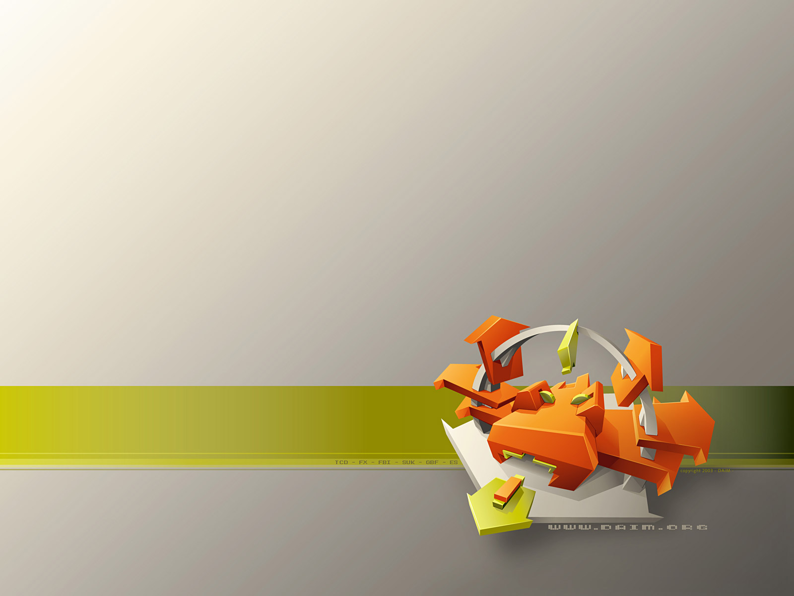 Description: A computer generated image of a bunch of orange pieces of paper on a gray background with a green stripe.