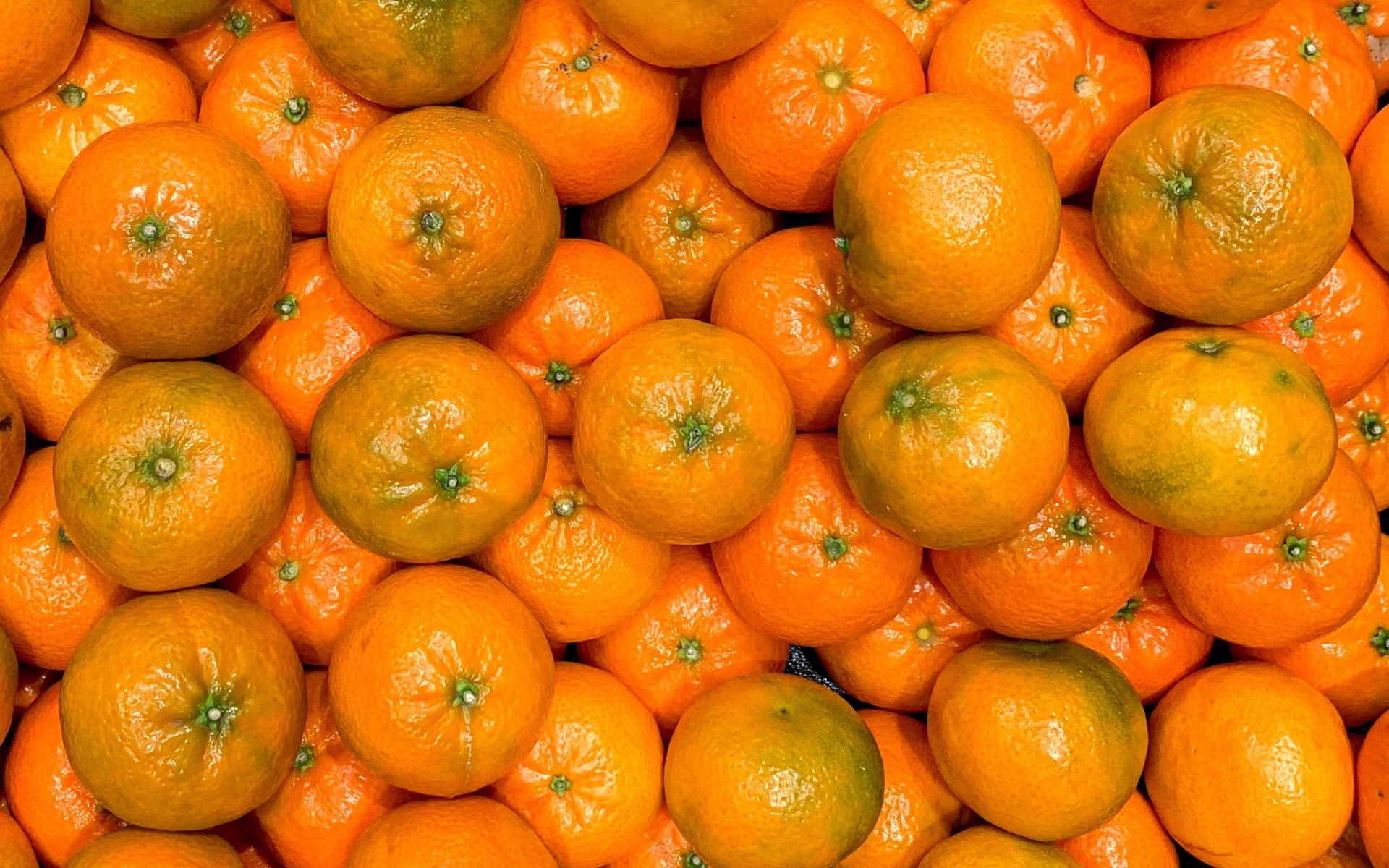 Description: A large pile of oranges with green stems on them and a few of them on top of each other.
