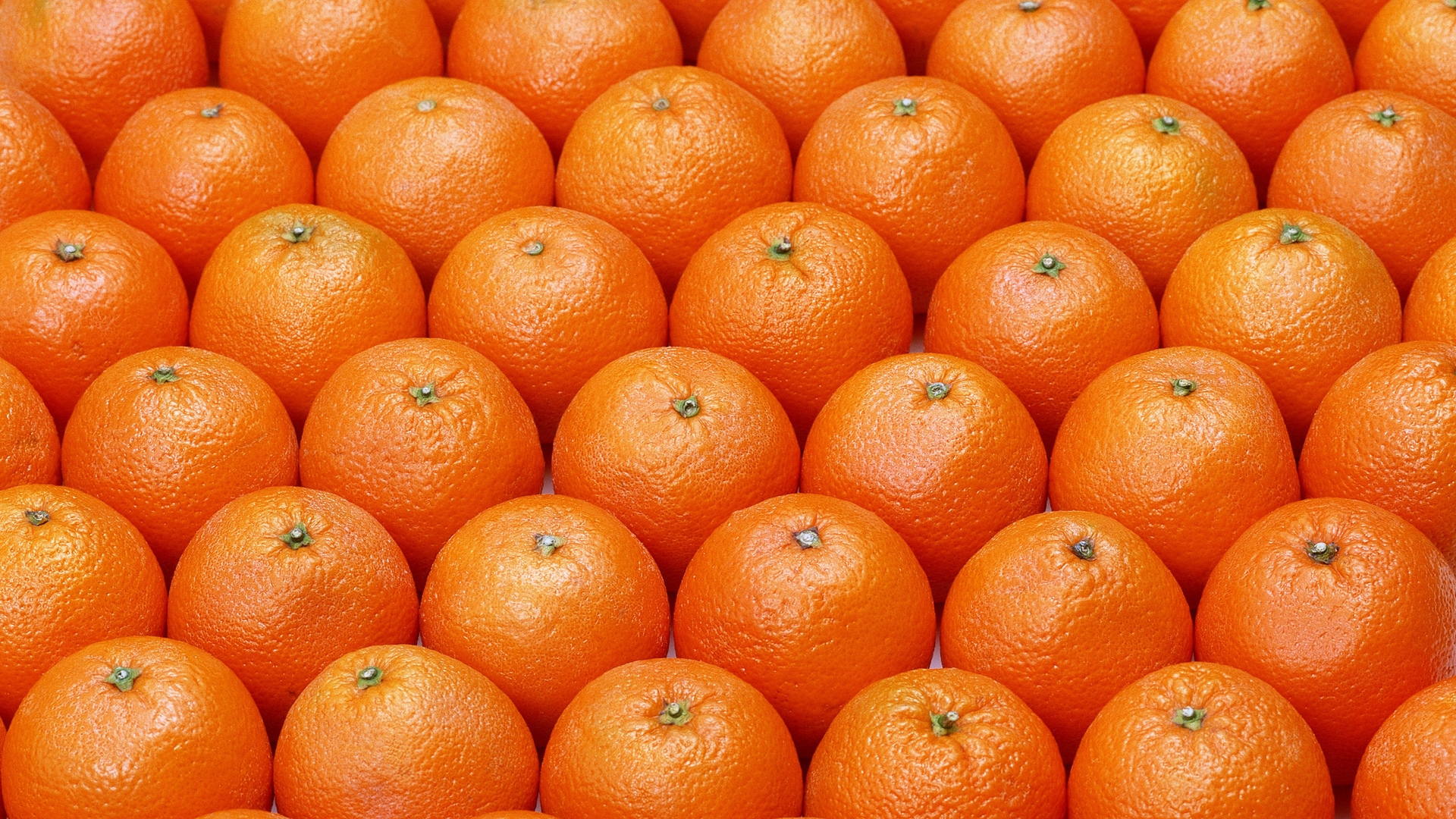 Description: A large group of oranges stacked on top of each other in a pile with green leaves on them.