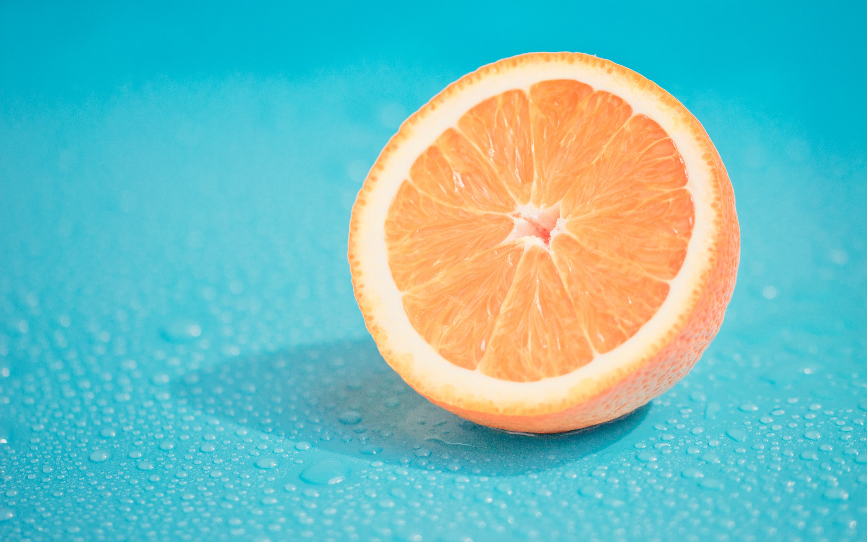 Description: A half of an orange sitting on a blue surface with water droplets on it's surface and a single slice of the orange in the middle.