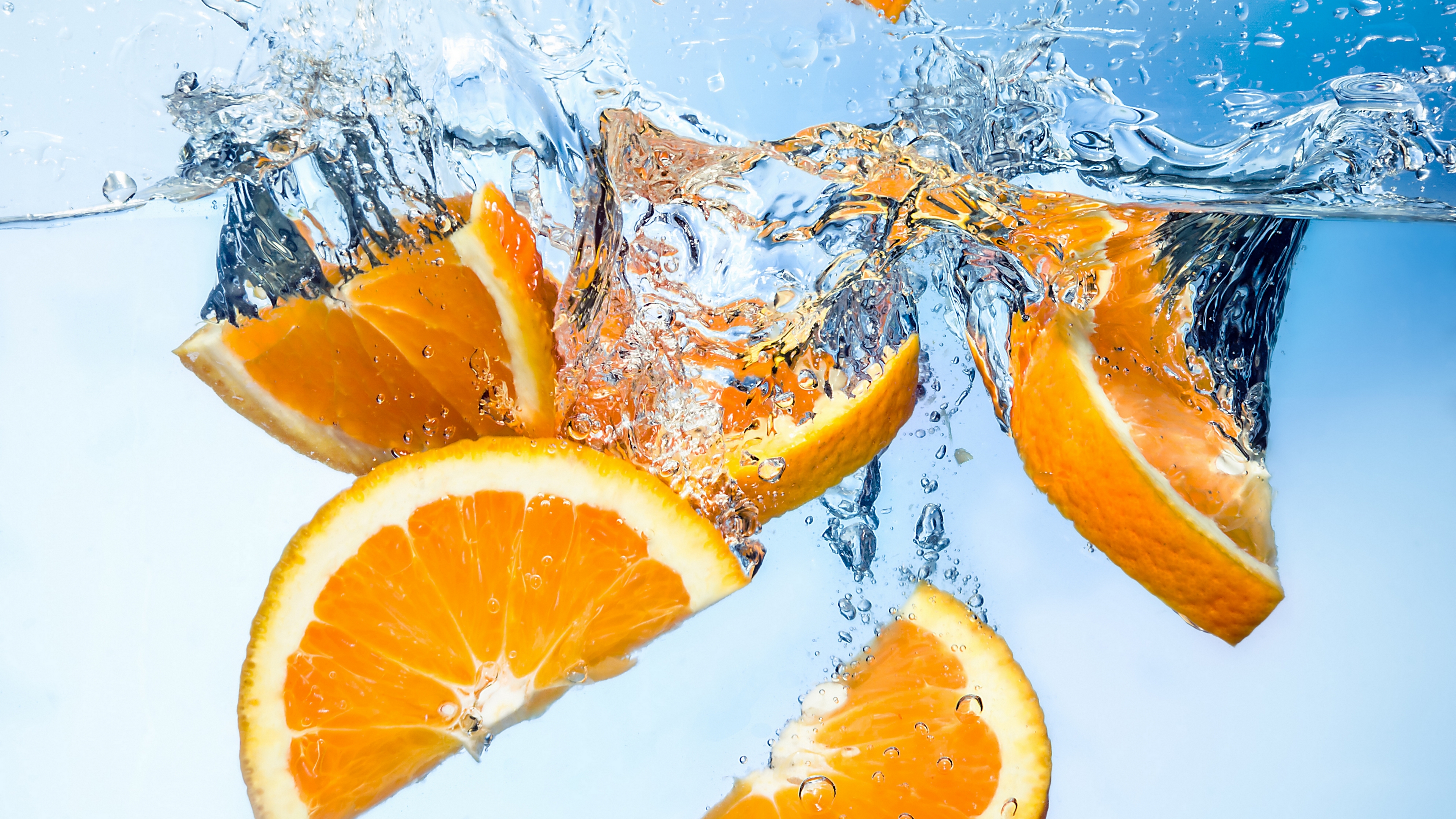 Description: Oranges are cut in half and are being dropped into the water with a splash of water on the top.