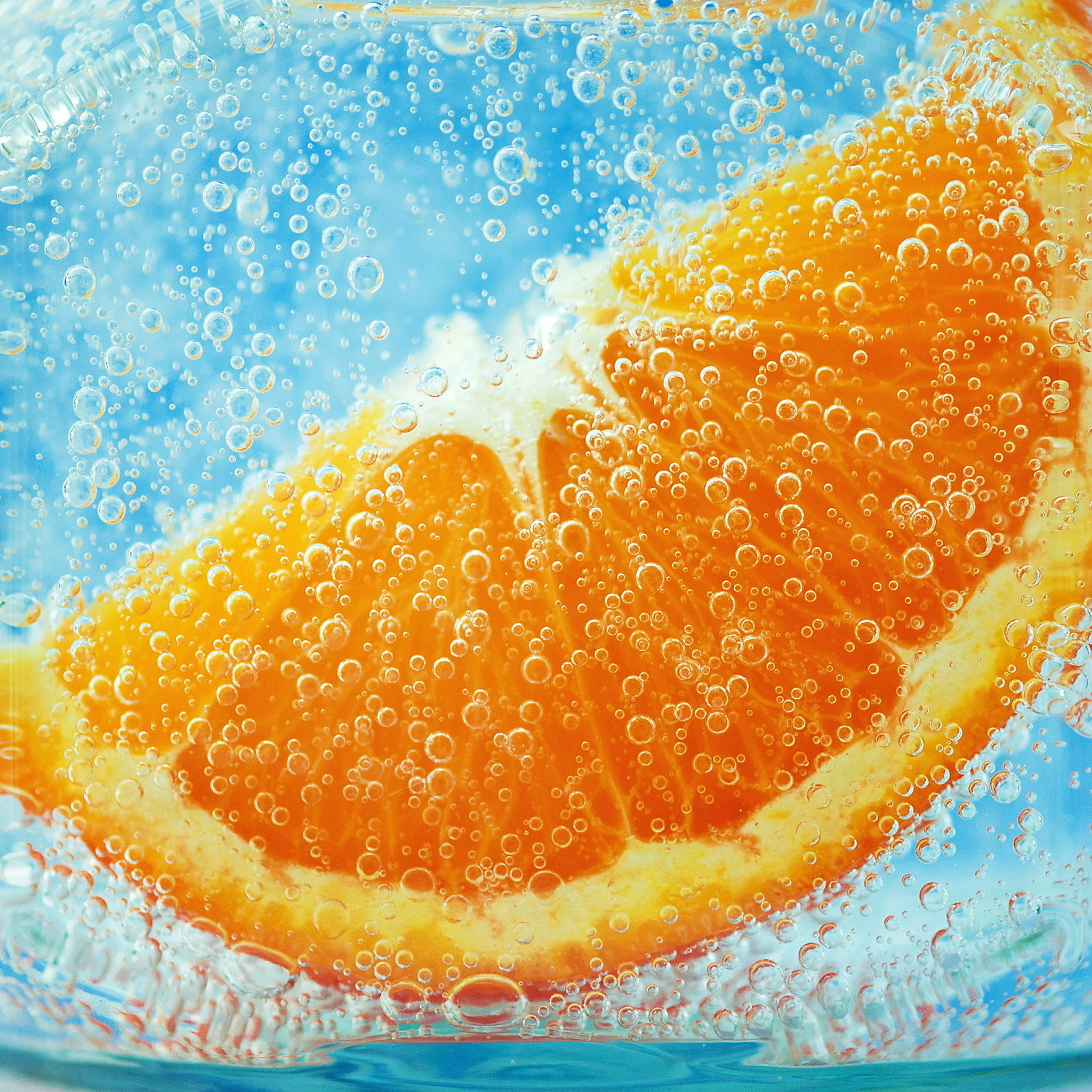 Description: A close up of an orange slice in a glass of water with bubbles on it and a blue sky background.