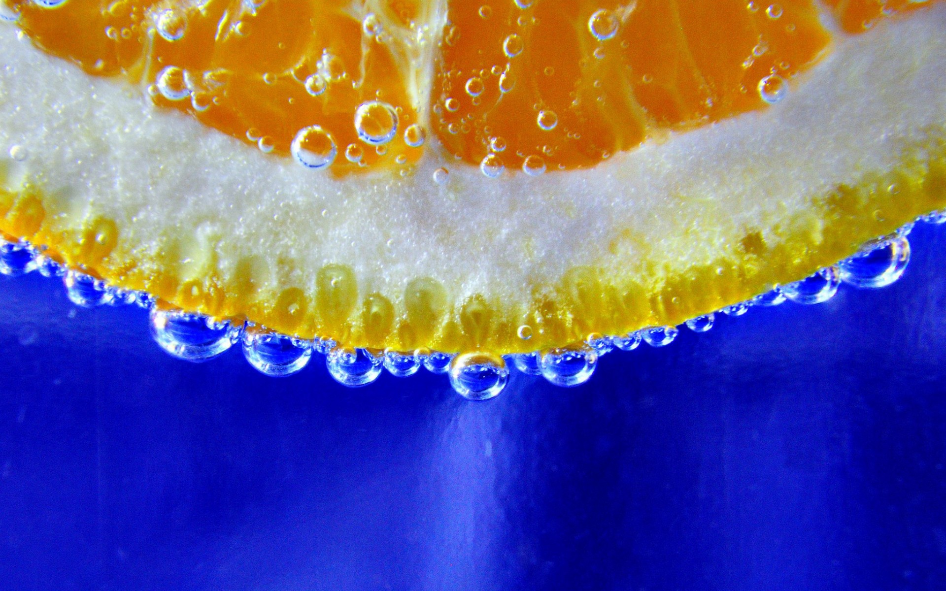 Description: A close up of an orange slice with water droplets on it's surface and a blue background with a white border.