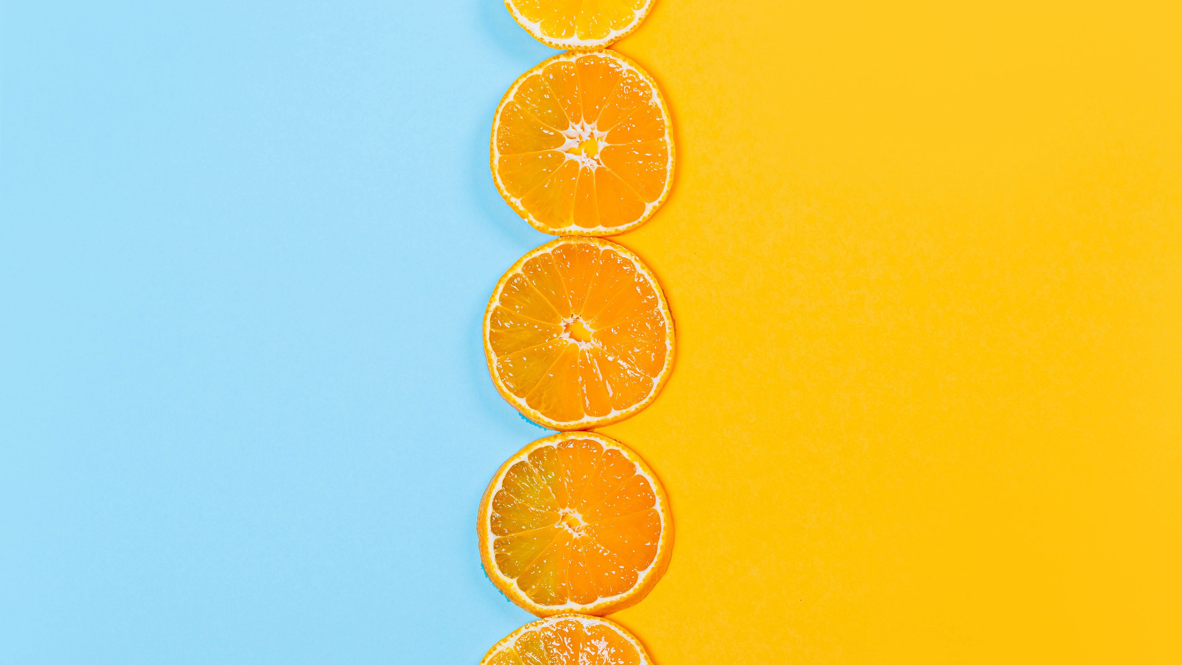 Description: A row of orange slices on a yellow and blue background with a blue border around them and a yellow border around them.