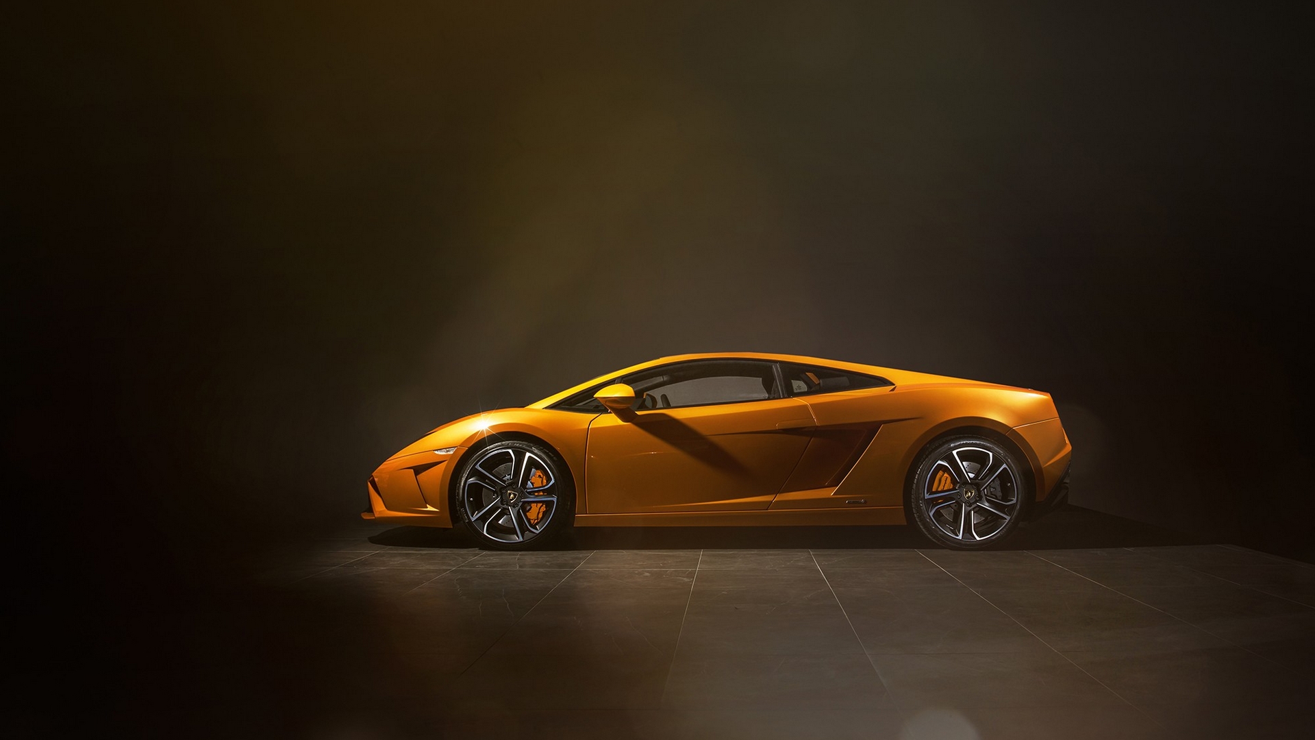 Description: A very nice looking orange sports car in a dark room with a spotlight on the floor and the door open.