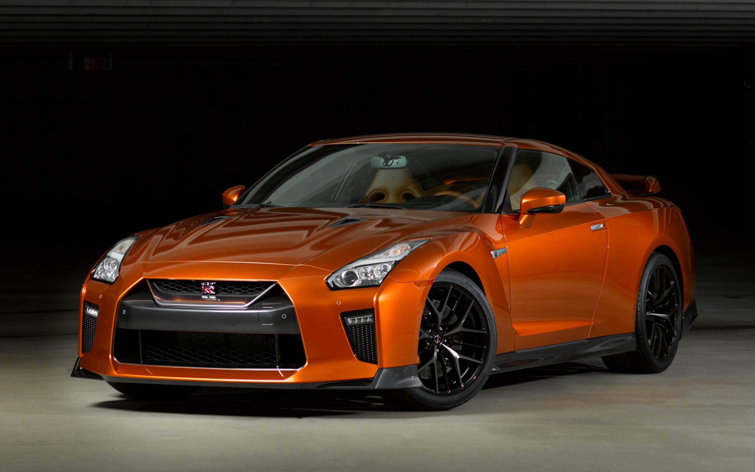 Description: A orange sports car parked in a garage with a dog in the window of the car in the front.