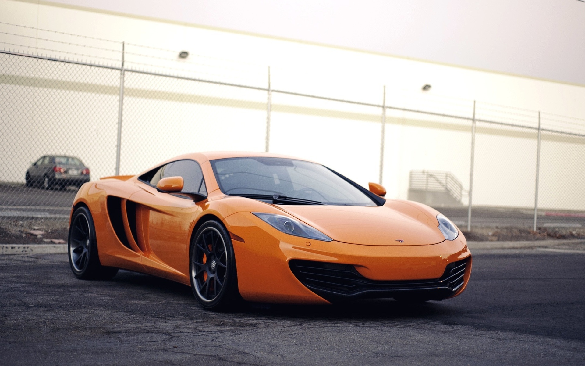 Description: A orange sports car parked in a parking lot next to a fence and a building with a chain link fence.
