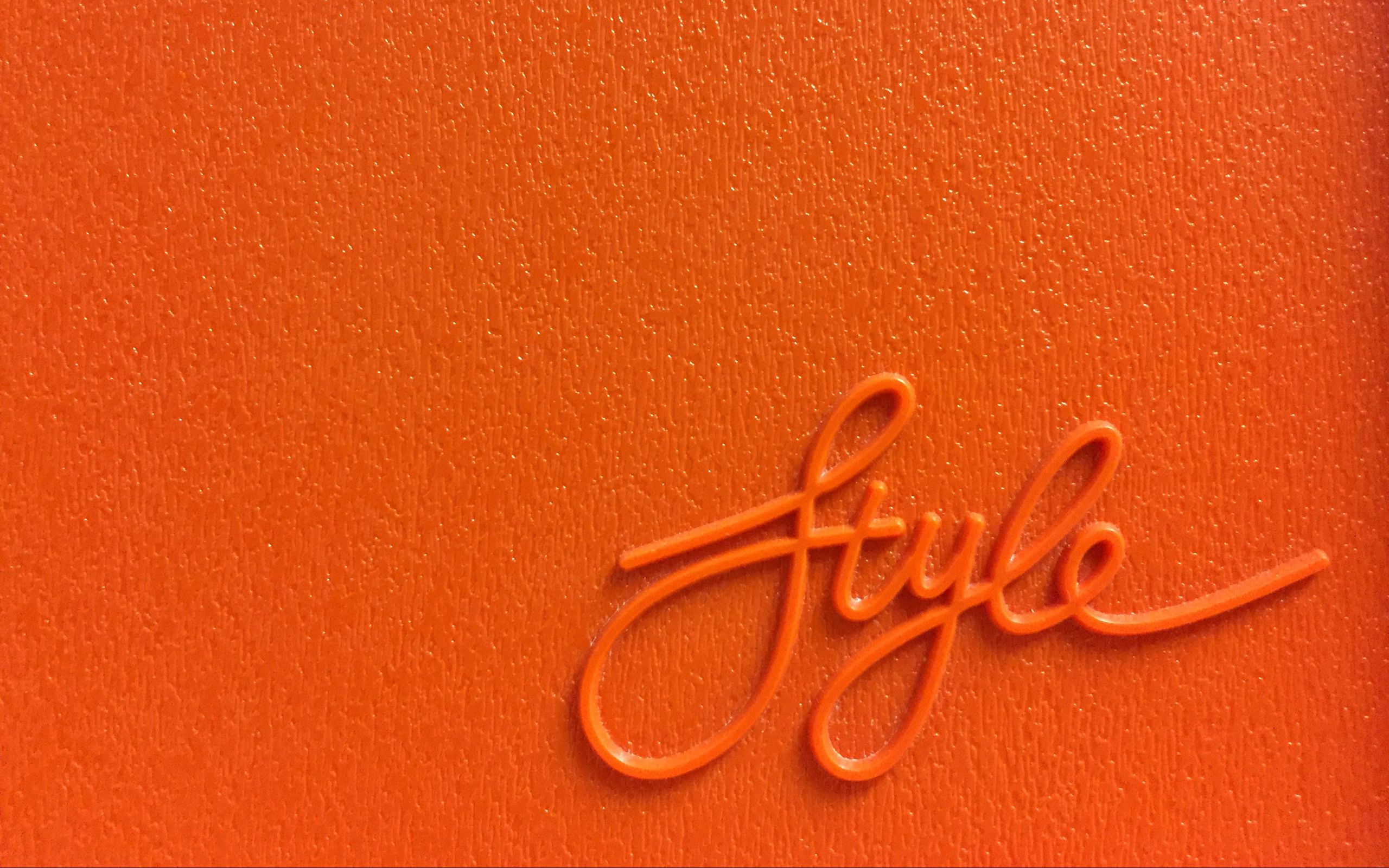 Description: A close up of a orange wall with a name on it and a name on the wall with a name.