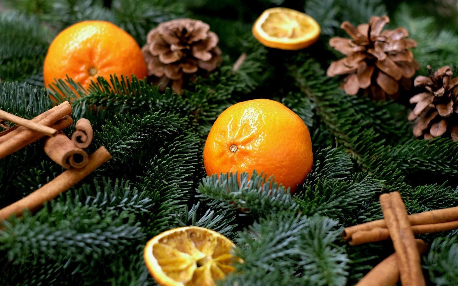 Description: A bunch of oranges and cinnamon sticks on a table with pine cones and cinnamon sticks on the table.