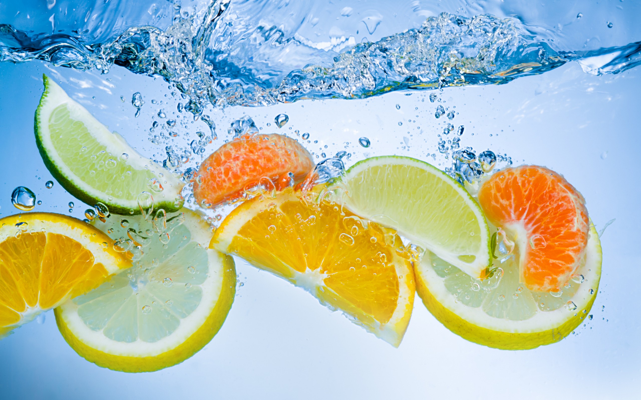 Description: A group of oranges and limes floating in water with bubbles and splashing on the surface of the water.