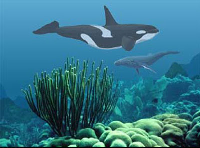 Description: A couple of orca whales swimming over a coral reef with seaweed and sea fan corals in the foreground.