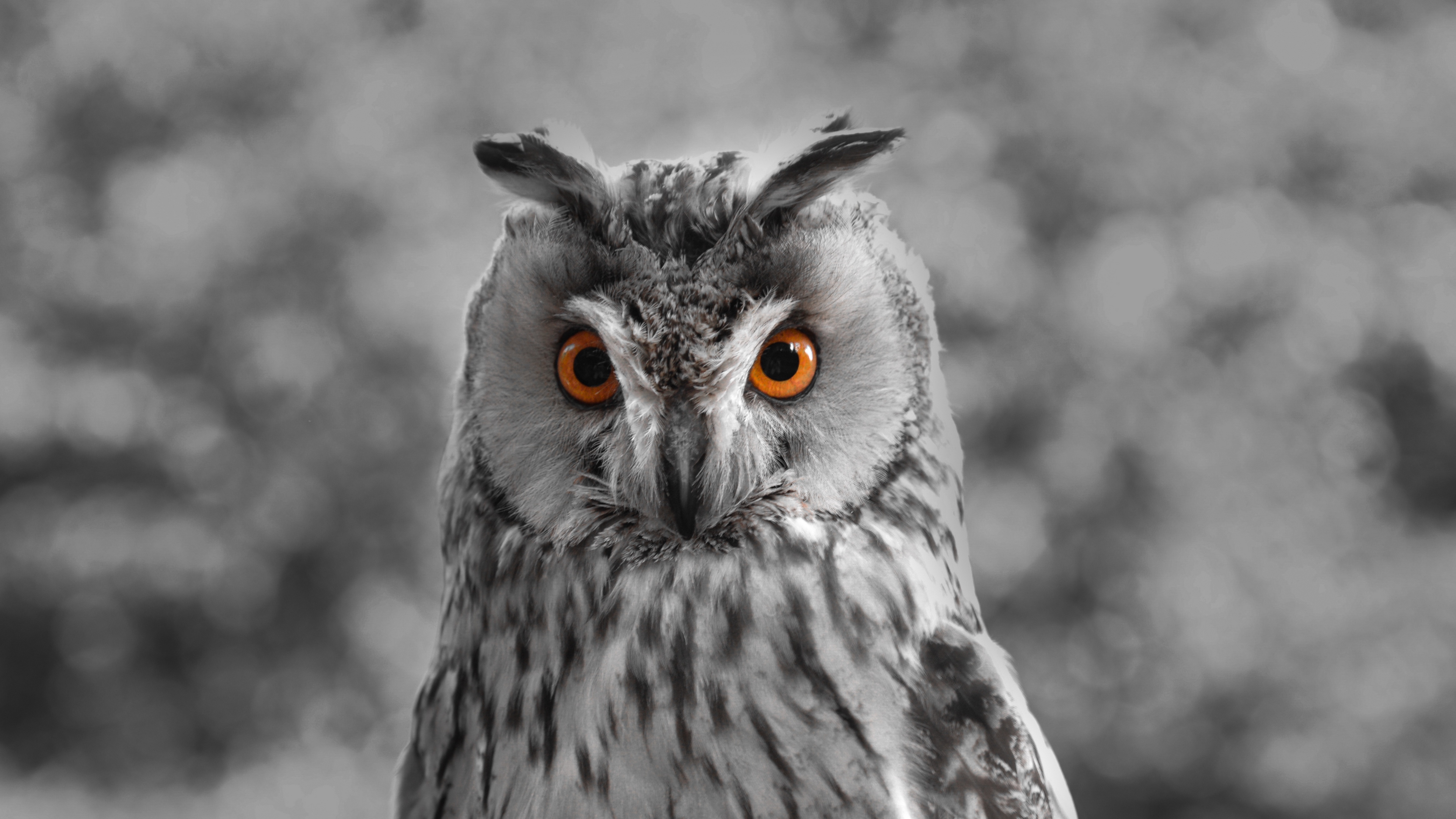 Description: A close up of an owl with orange eyes and a blurry background of trees and bushes in the background.