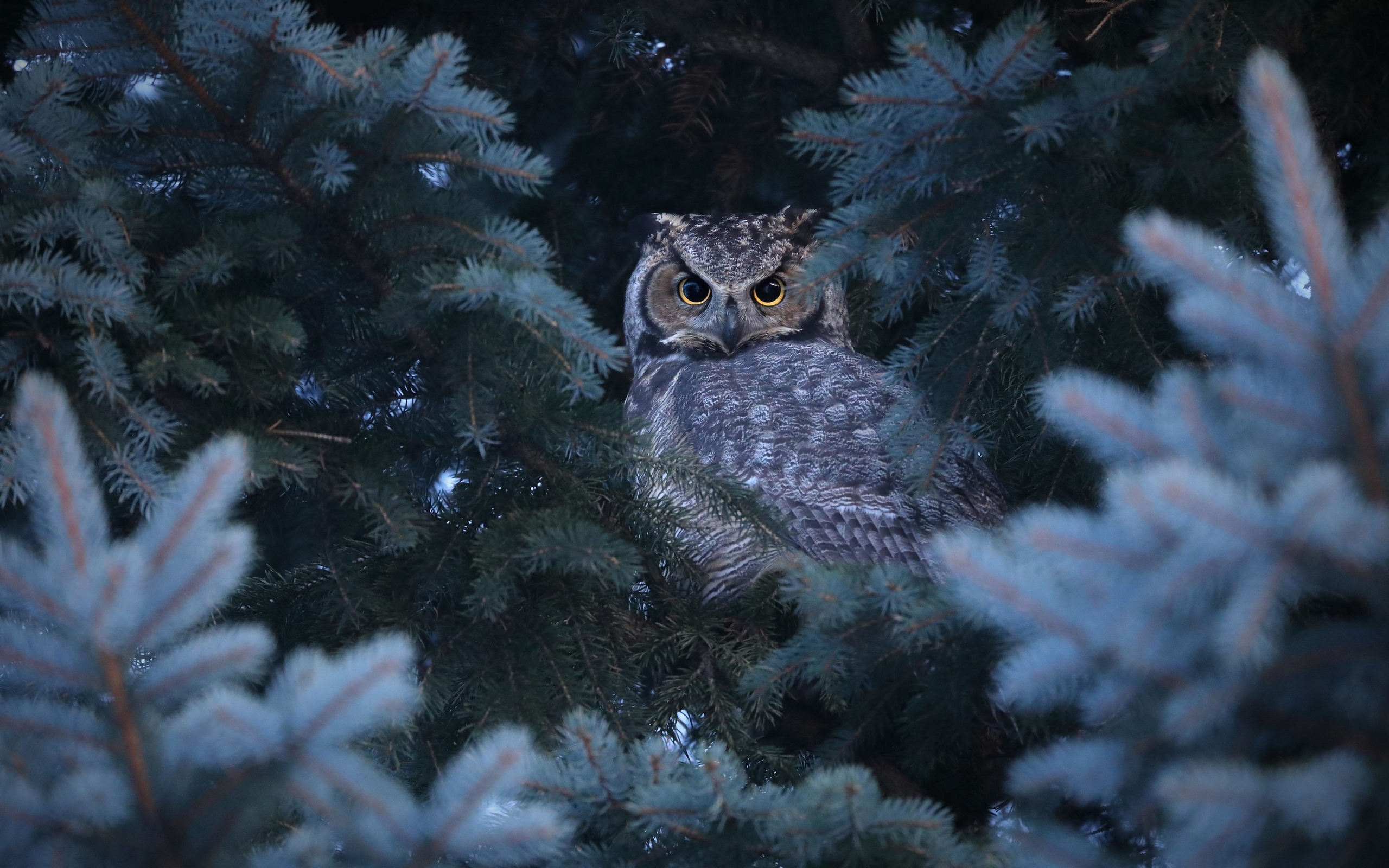 Description: An owl is sitting in a tree looking out from behind the branches of a tree with snow on it.