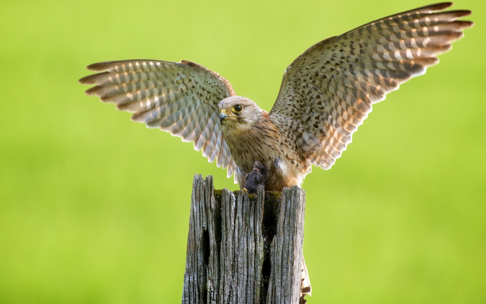 Description: A bird with its wings spread sitting on a wooden post with its wings spread wide open and spread wide.