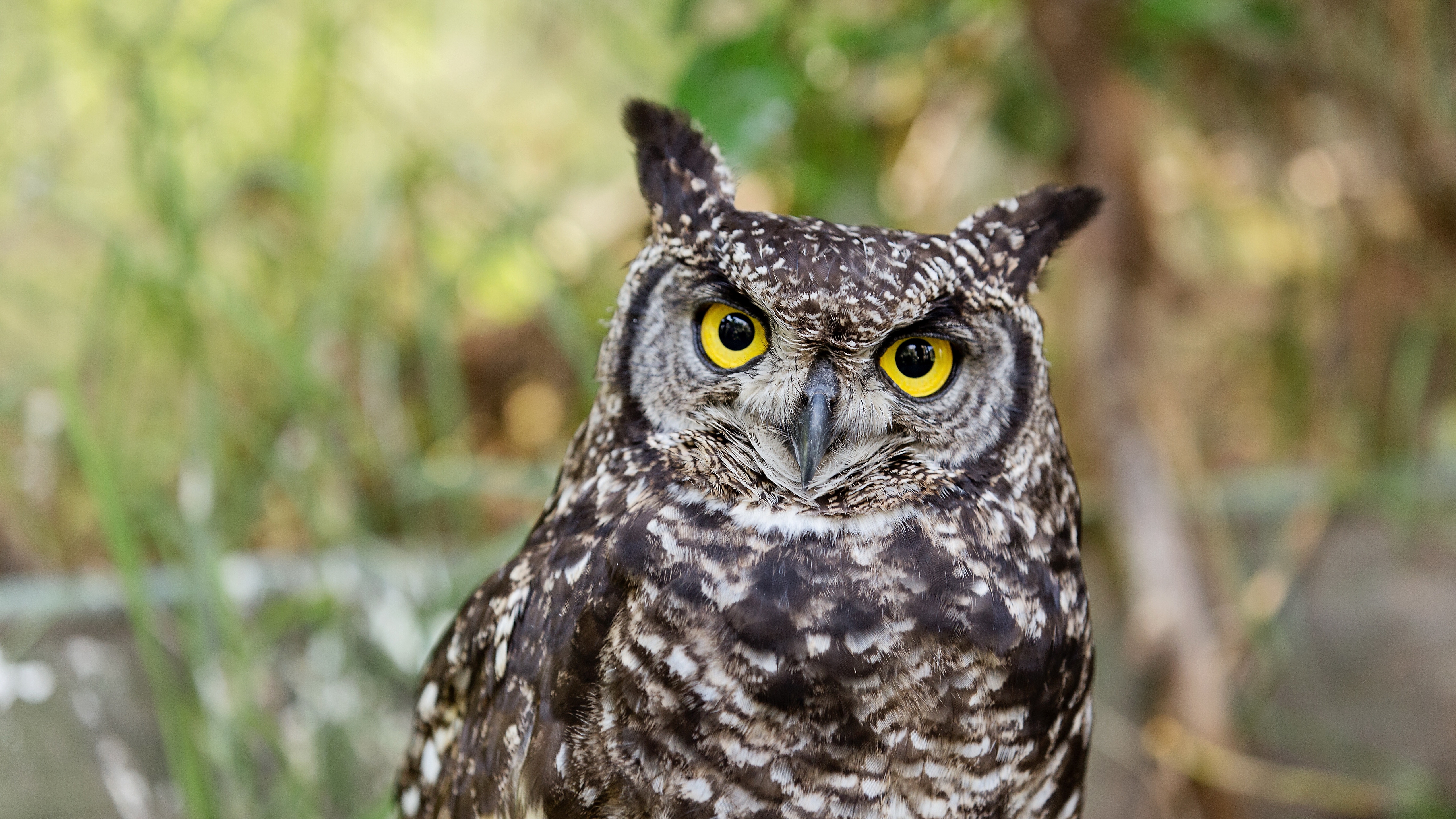 Description: A close up of a owl with yellow eyes and a blurry background of trees and bushes in the background.