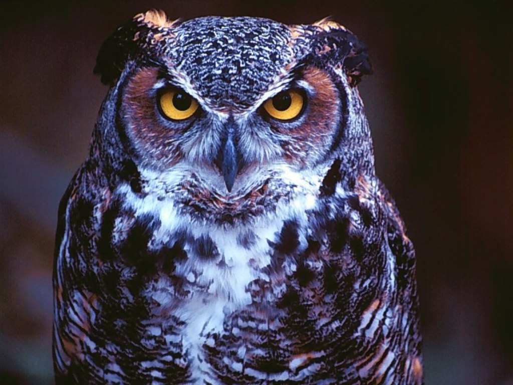 Description: An owl with yellow eyes is looking at the camera with a blurry background of trees and branches in the background.