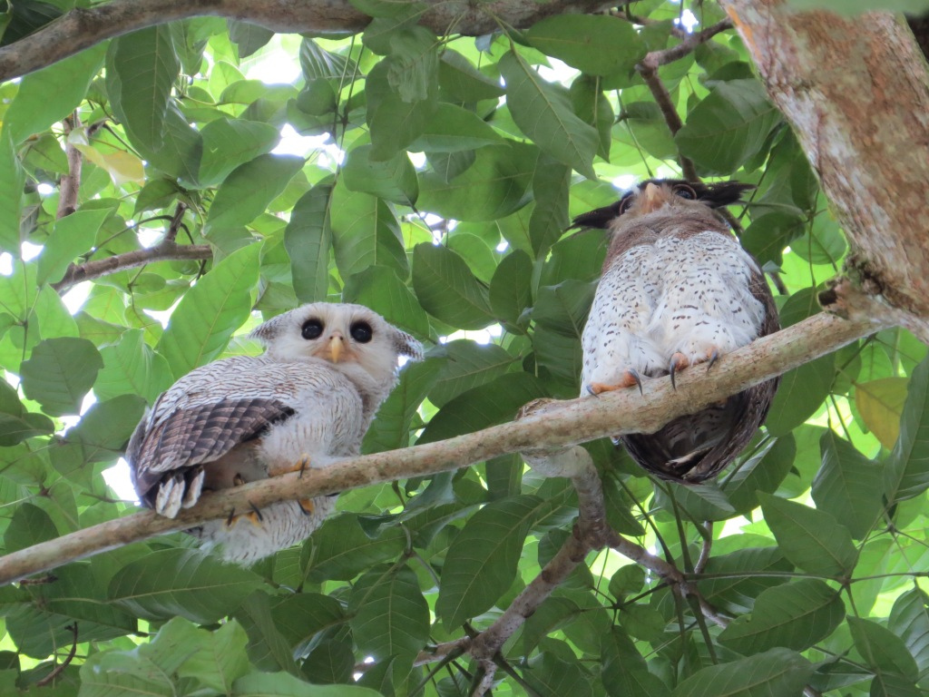 Description: Two owls sitting on a branch in a tree looking at each other with eyes open and one owl looking at the other.
