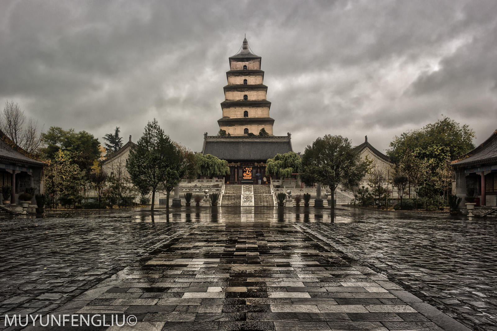 Description: A large pagoda with a clock tower in the background on a cloudy day with a checkered floor and trees.