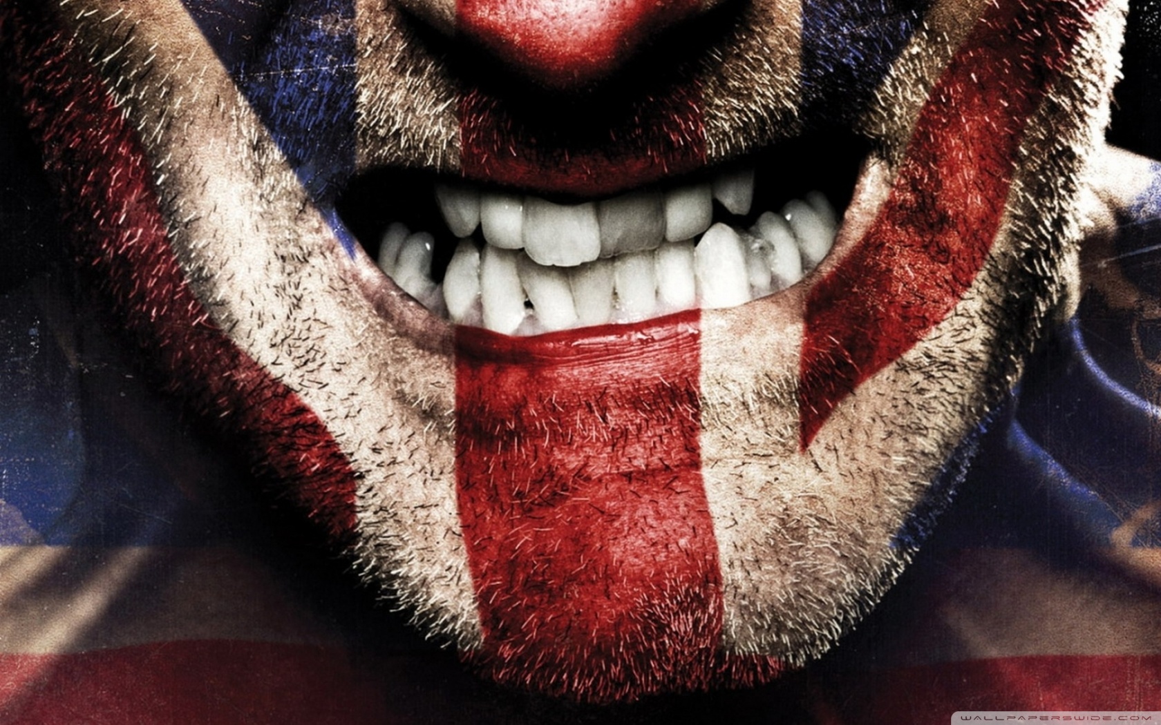 Description: A man with a painted face and a flag on his face is smiling for the camera with his teeth.
