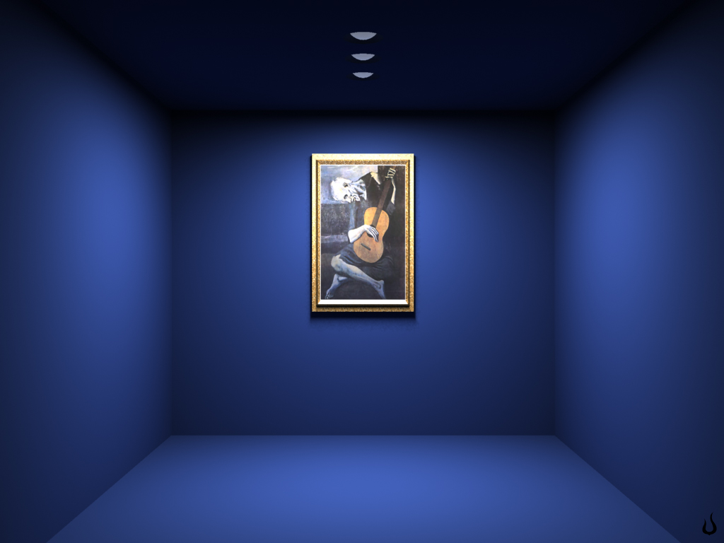Description: A painting hanging on a wall in a room with blue walls and a blue floor and a blue wall.