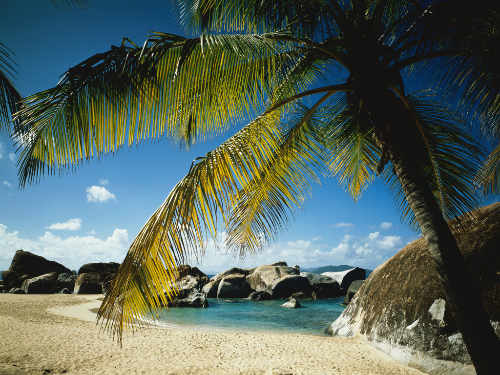 Description: A palm tree leaning over a beach with rocks in the background and a blue sky with clouds in the background.