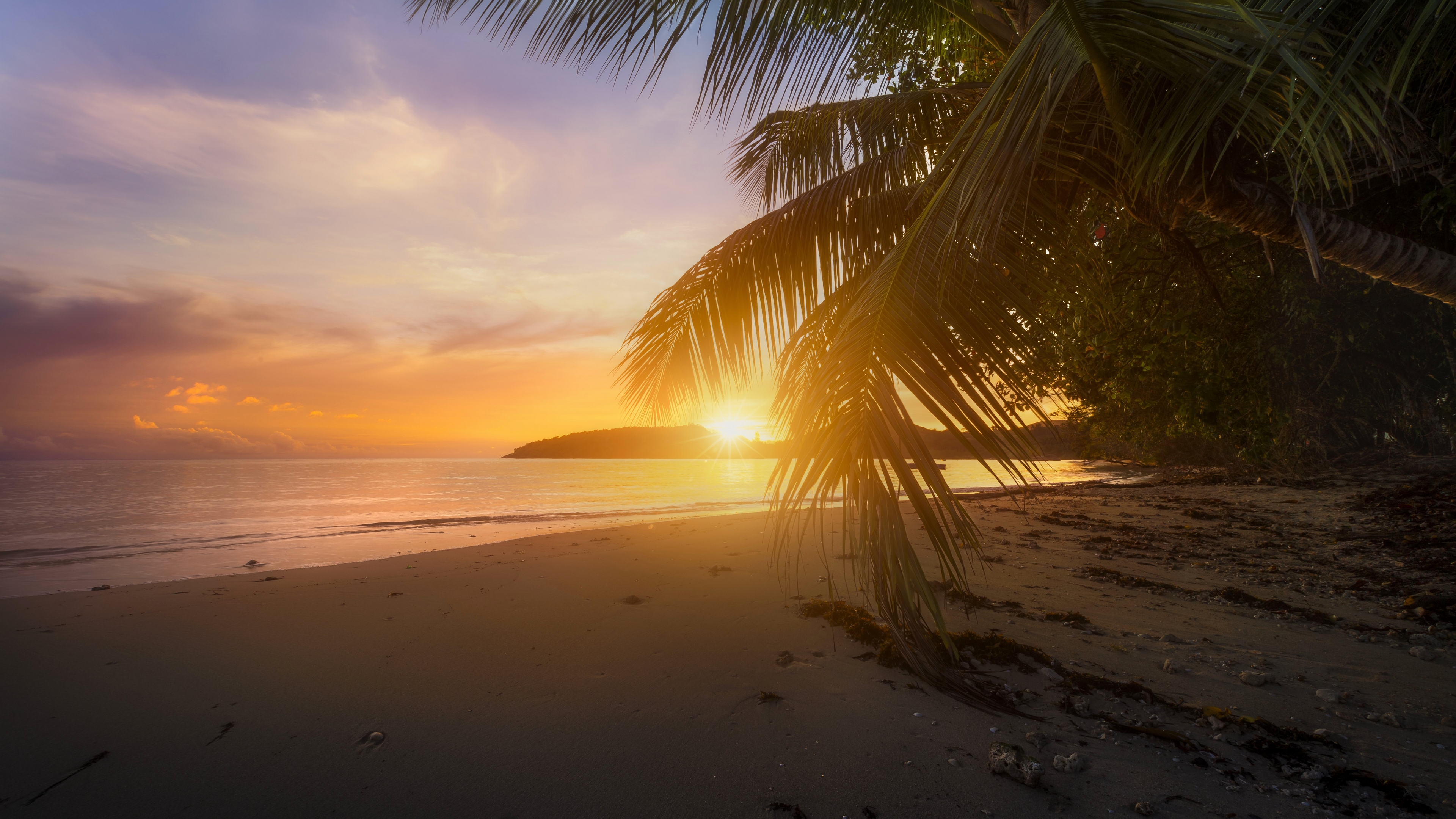 Description: A palm tree on a beach with the sun setting in the background and a mountain in the distance with a body of water in the foreground.