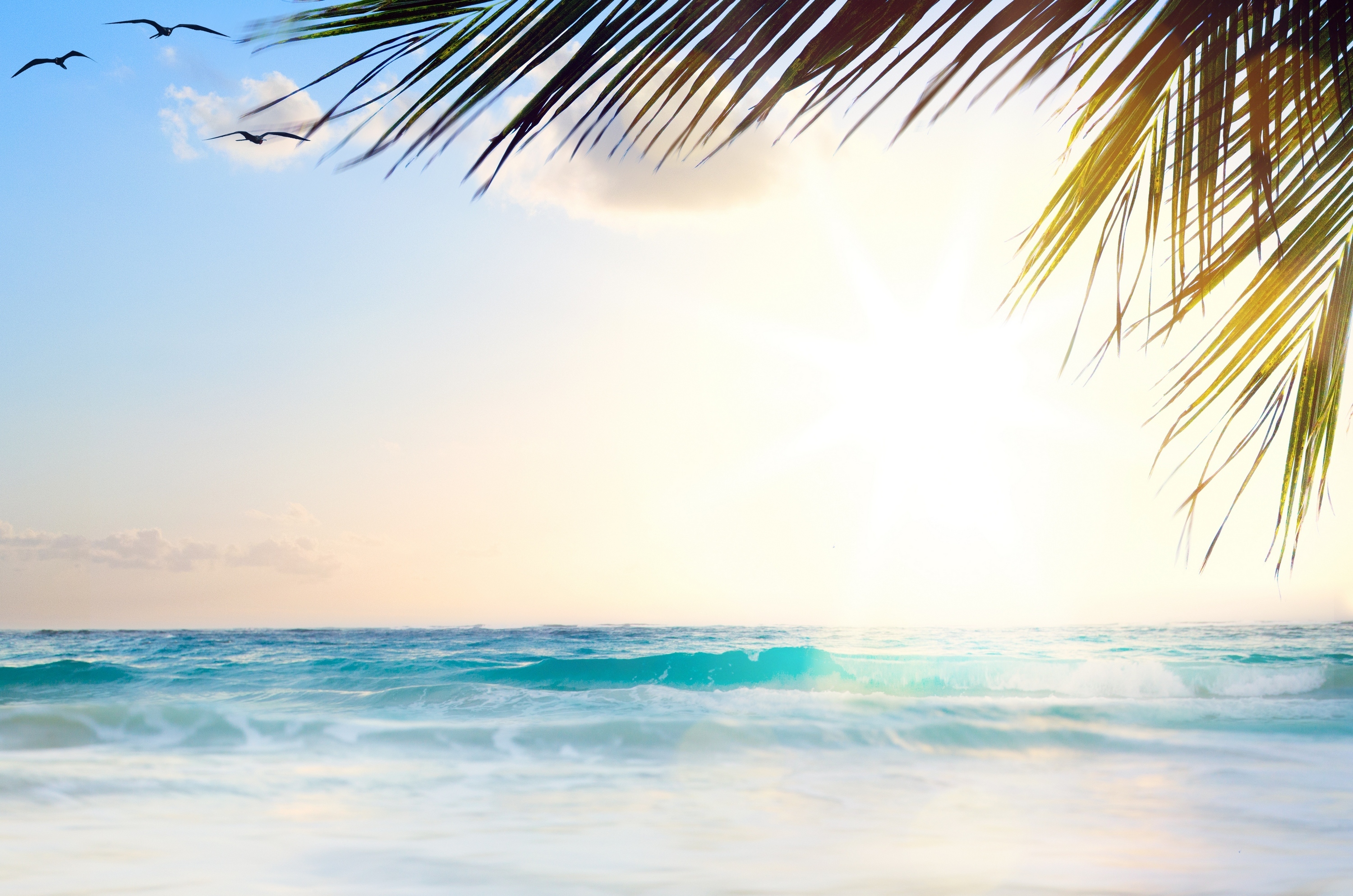 Description: A palm tree branch over the ocean with a sun in the background and birds flying overhead in the sky.