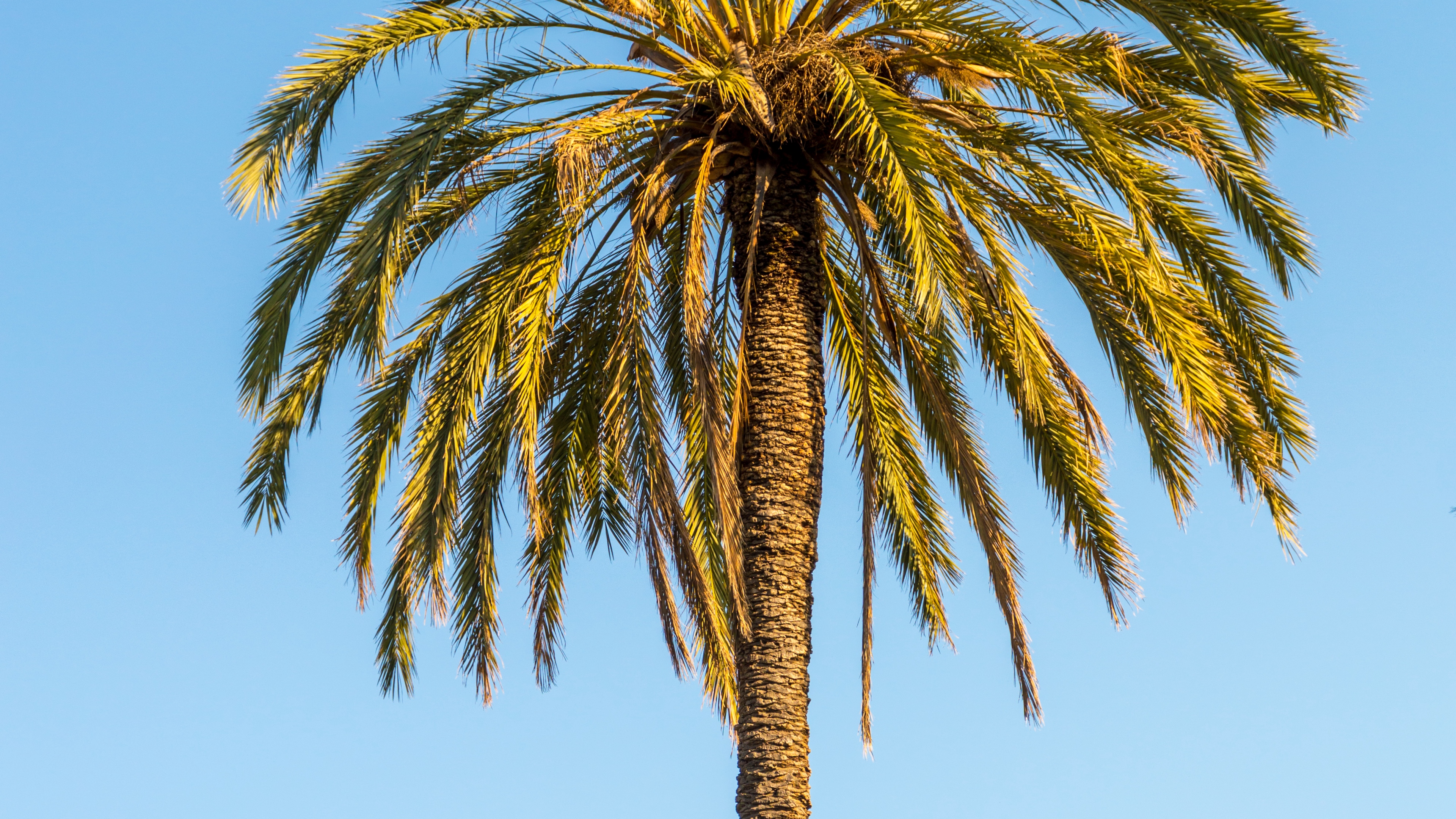 Description: A palm tree with a blue sky in the background and a plane flying overhead in the background.