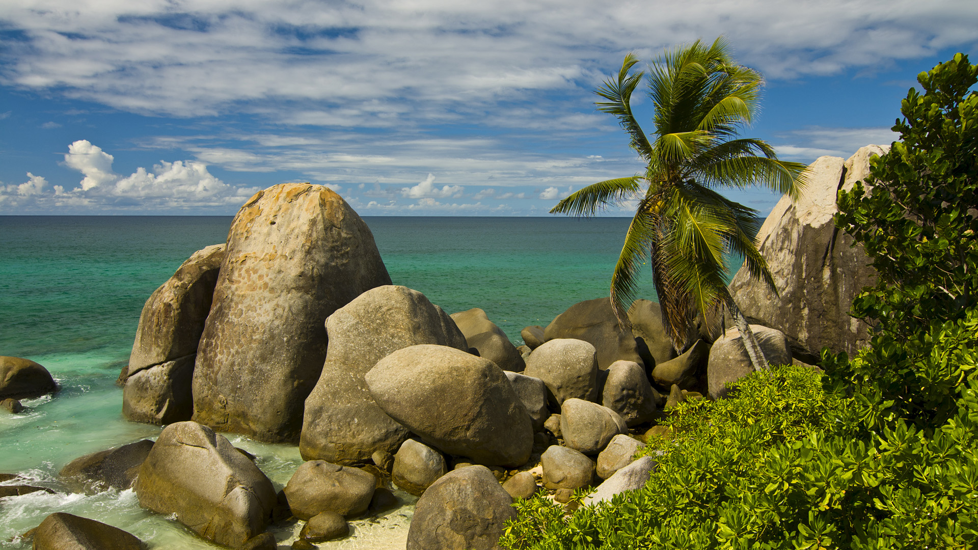 Description: A palm tree is growing on a rocky beach near the ocean and a rock wall with a beach in the background.