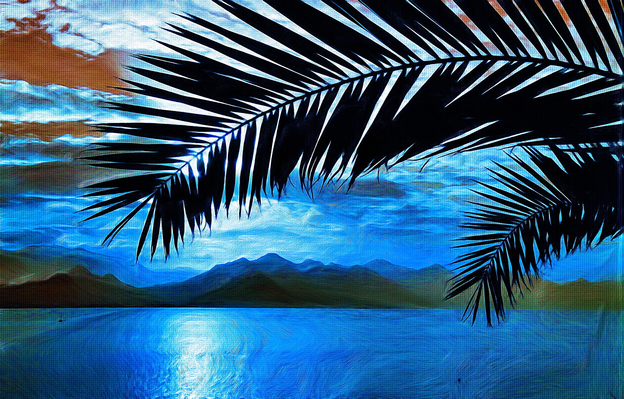 Description: A painting of a palm tree and a body of water with mountains in the background and a blue sky.