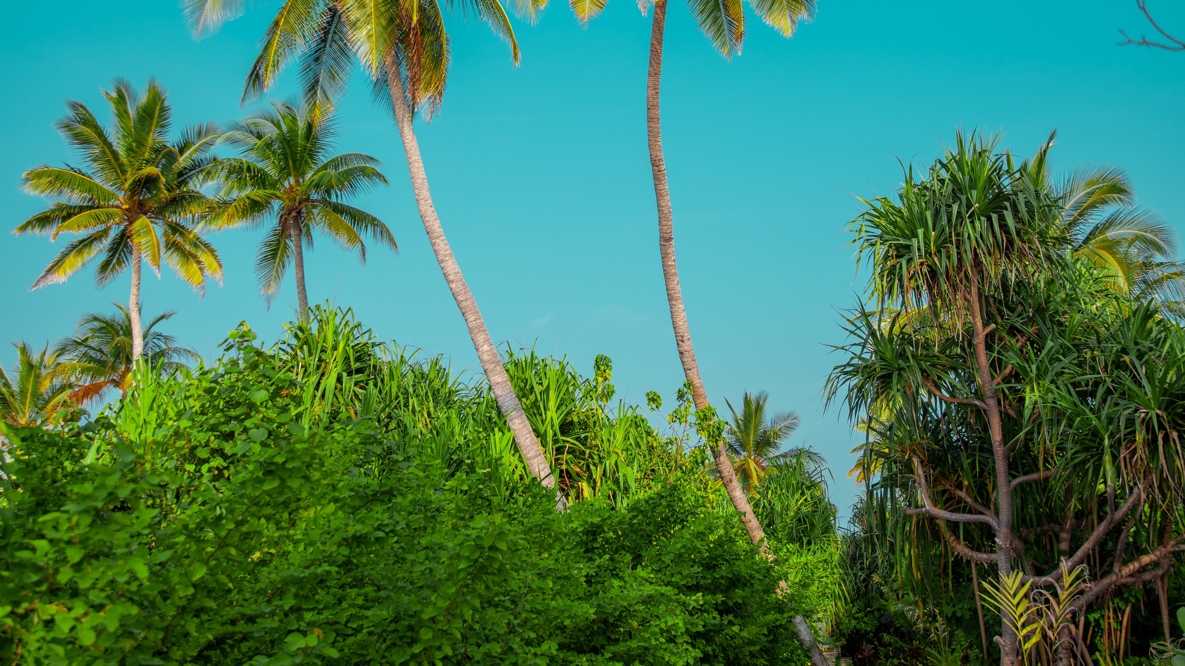 Description: A group of palm trees in a forest with a blue sky in the background and a few clouds in the sky.