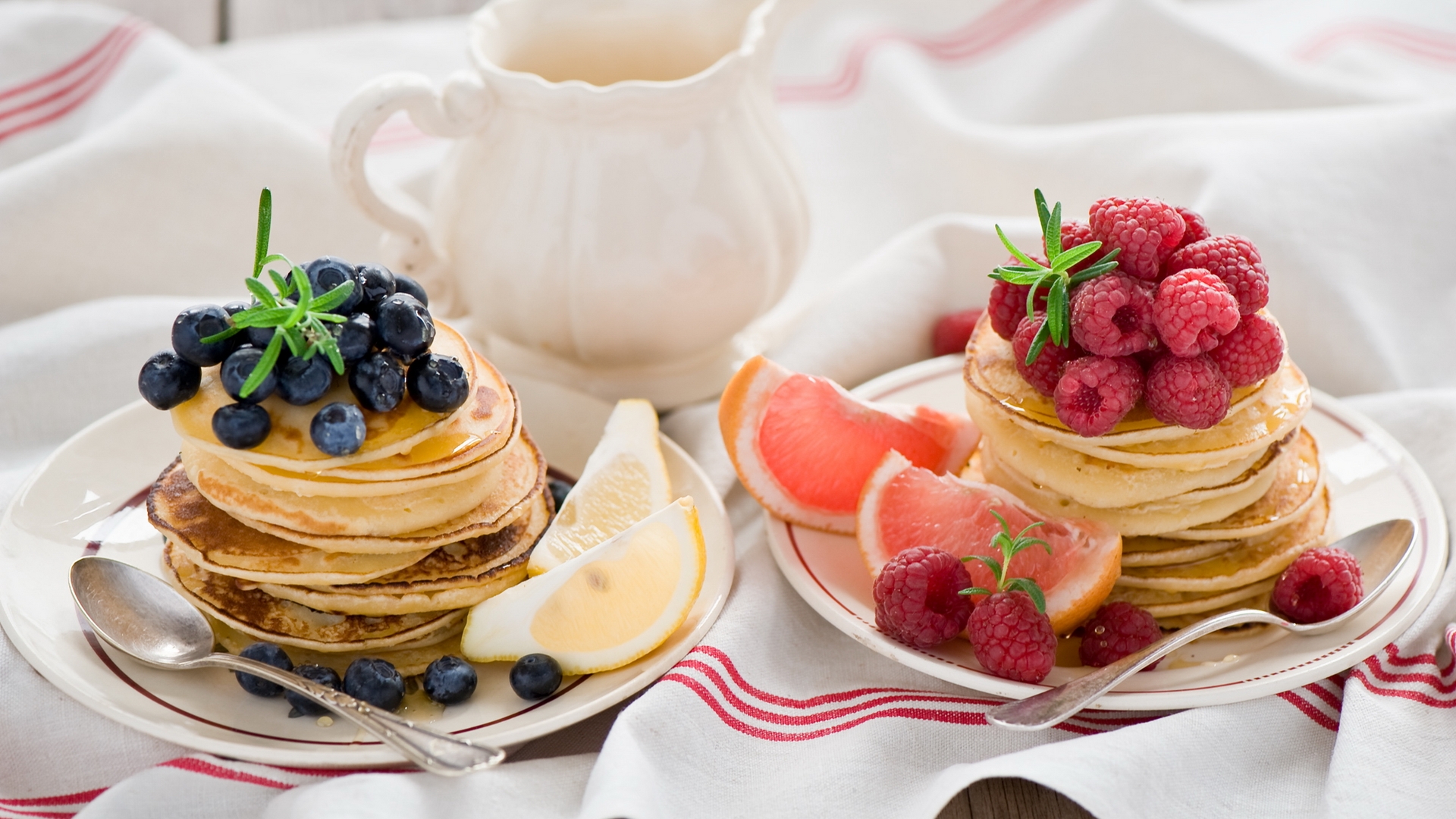 Description: A plate of pancakes with fruit on top of it and a pitcher of milk in the background on a table.