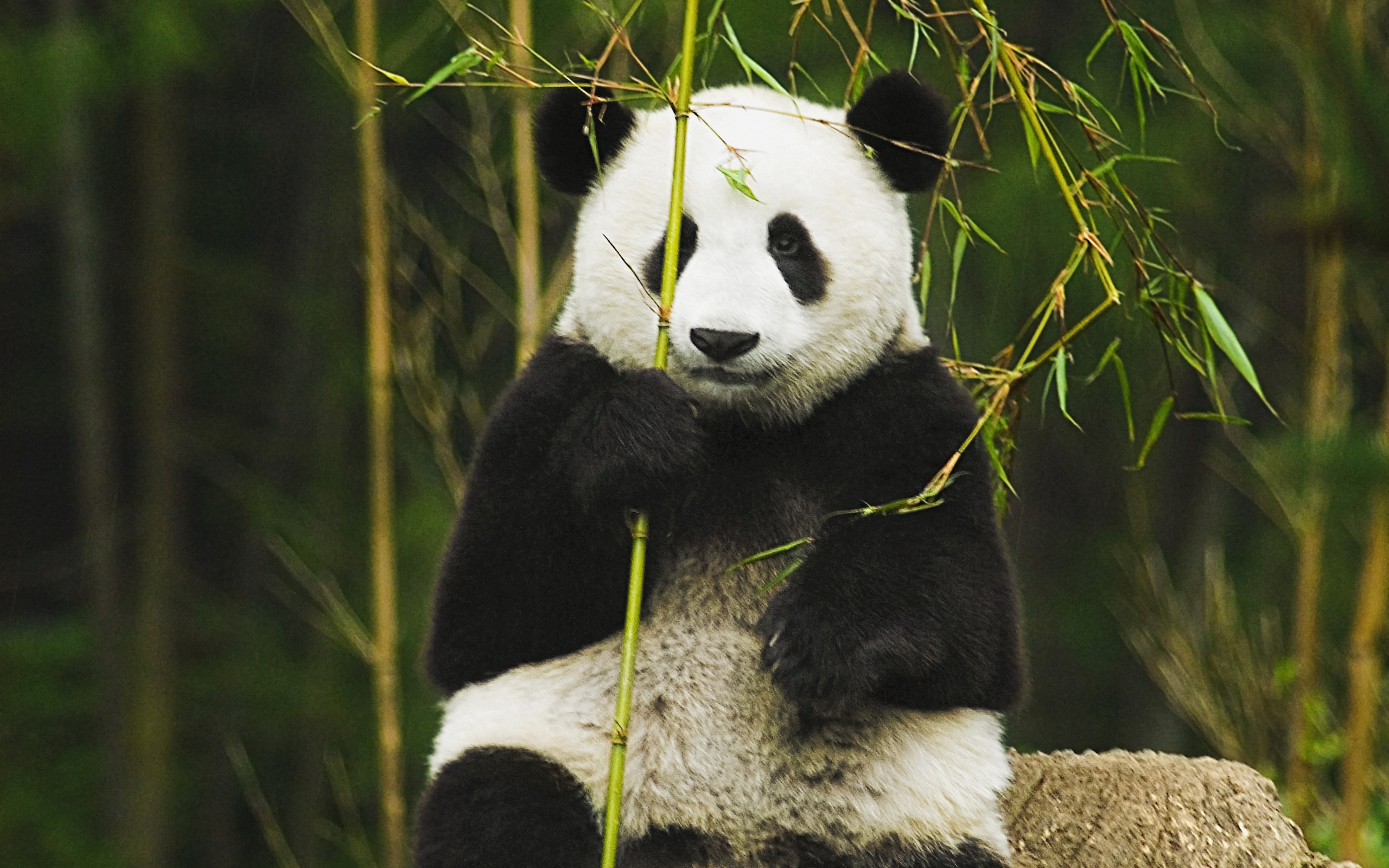 Description: A panda bear sitting on a rock eating bamboo leaves in a forest of bamboo trees and bushes.