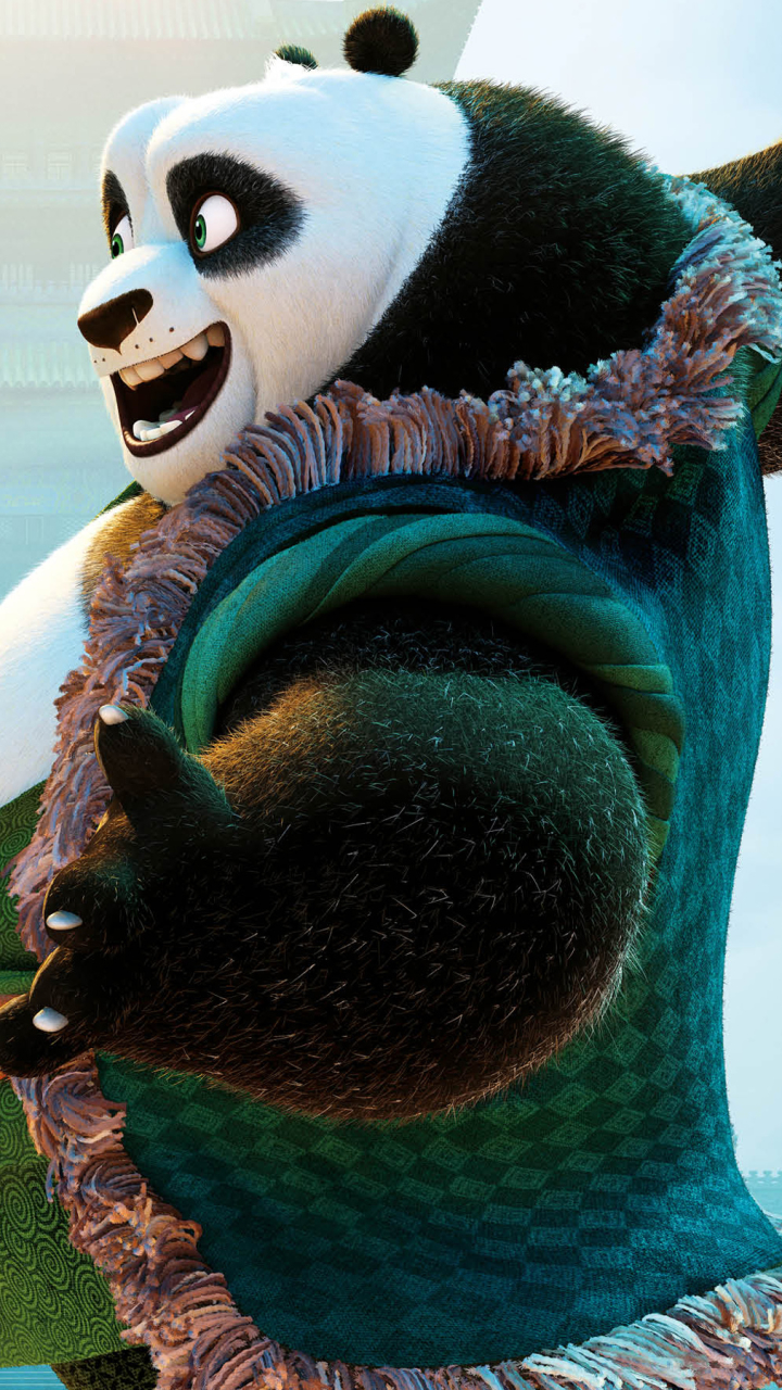 Description: A panda bear dressed in a green and purple outfit with a large smile on his face and chest.