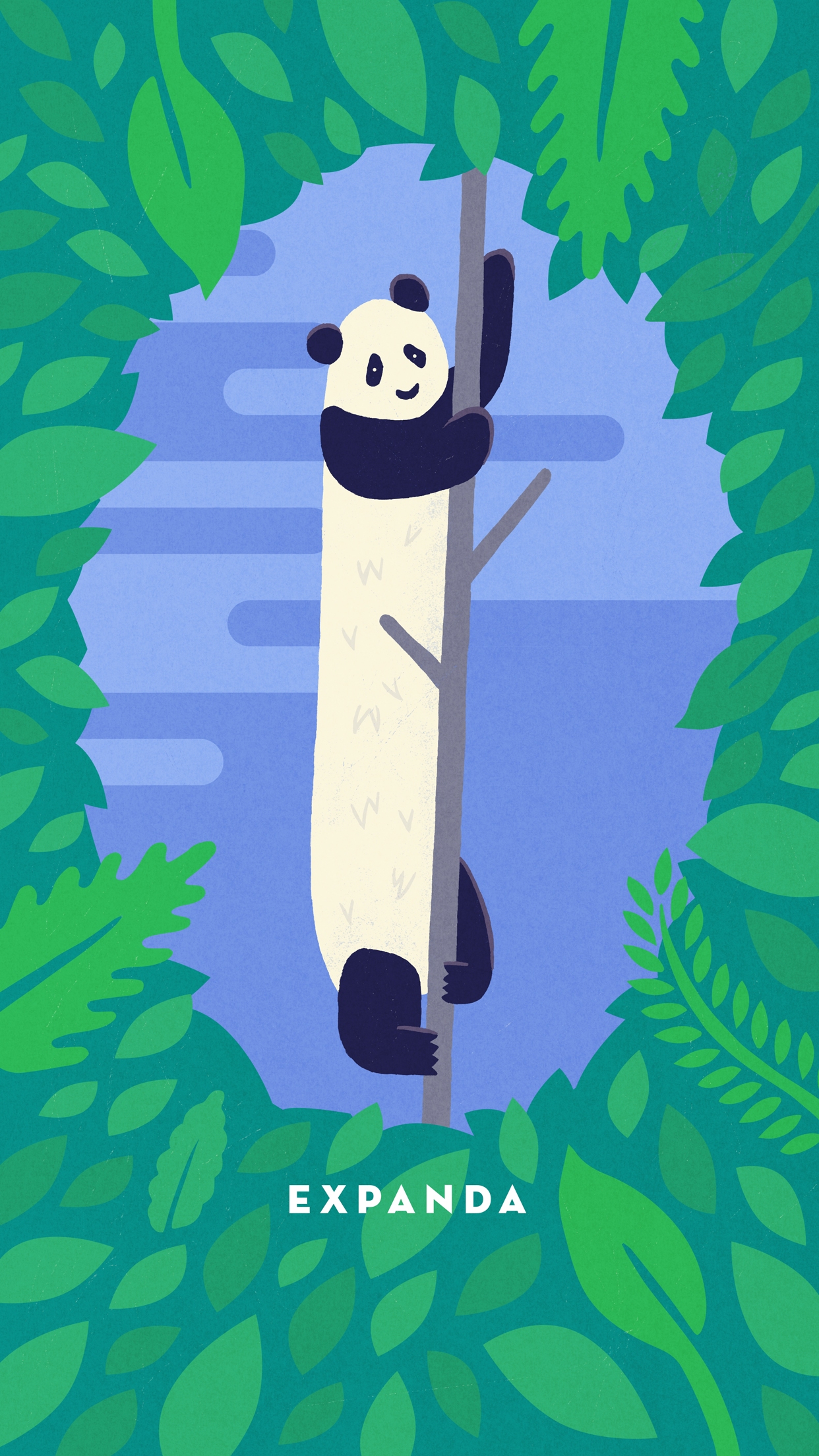 Description: A panda bear hanging on to a tree branch in the jungle with leaves around it and the words expand above it.