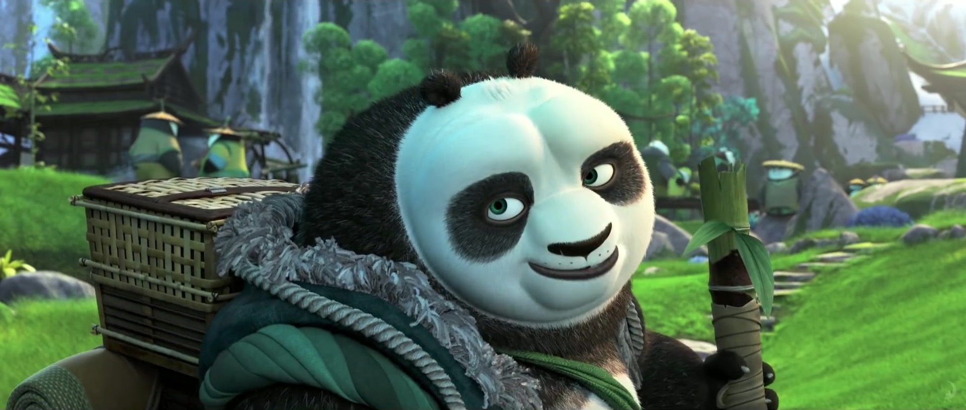 Description: A panda bear holding a bamboo stick in a cartoon scene with a forest and a building in the background.