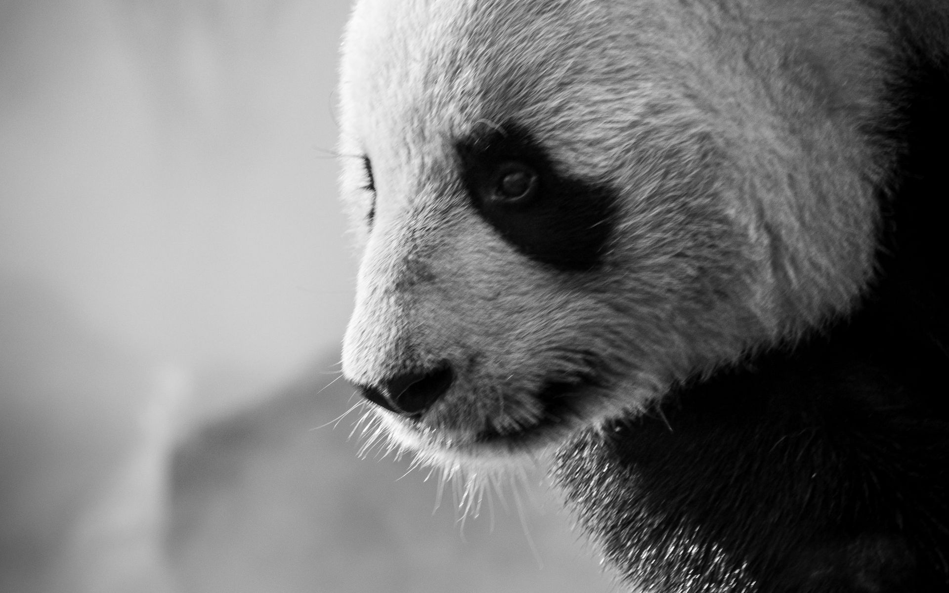 Description: A black and white photo of a panda bear's face and head with a blurry background of the panda.