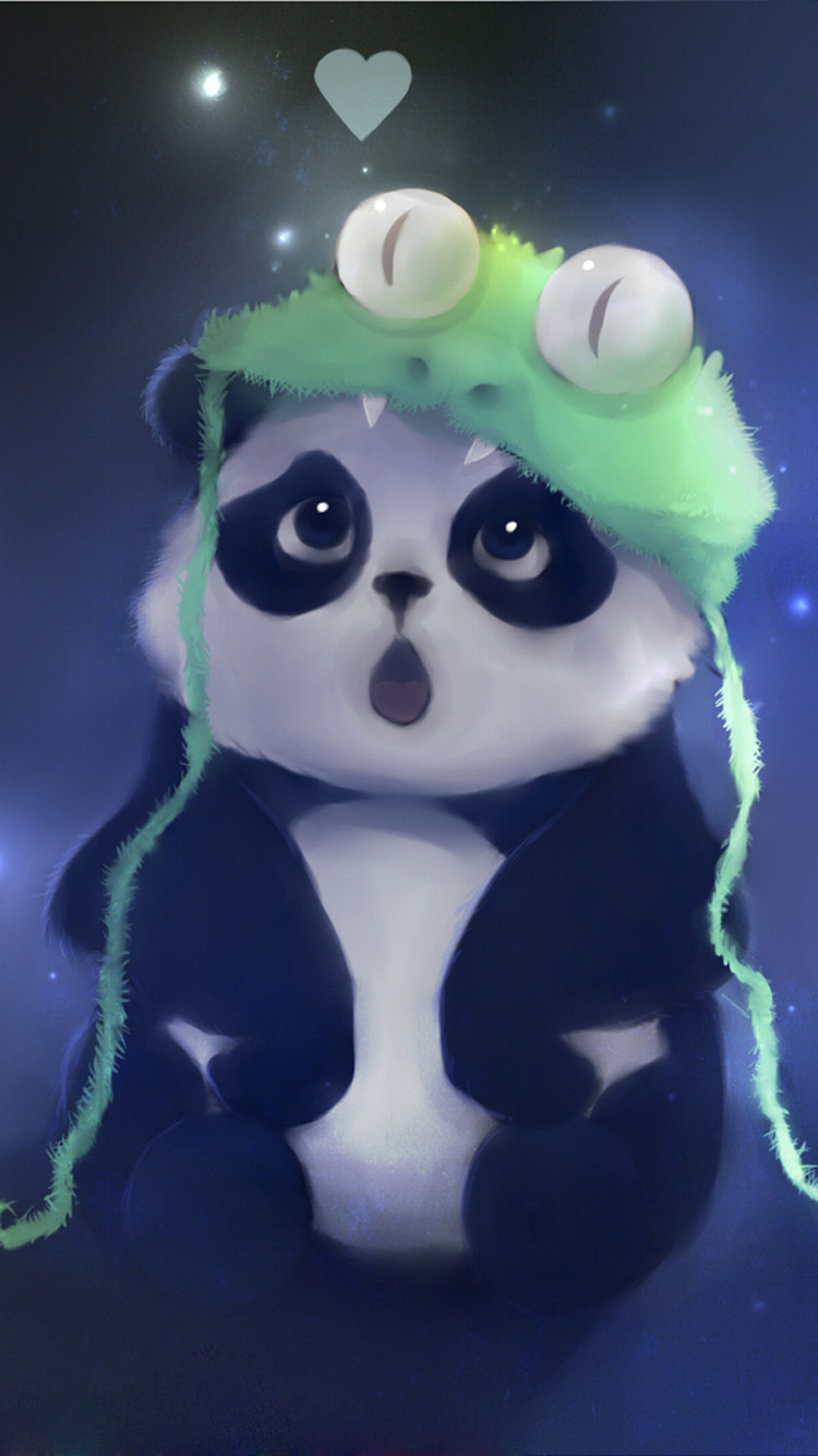 Description: A panda bear with a green hat on its head and eyes sitting down with a heart above its head.