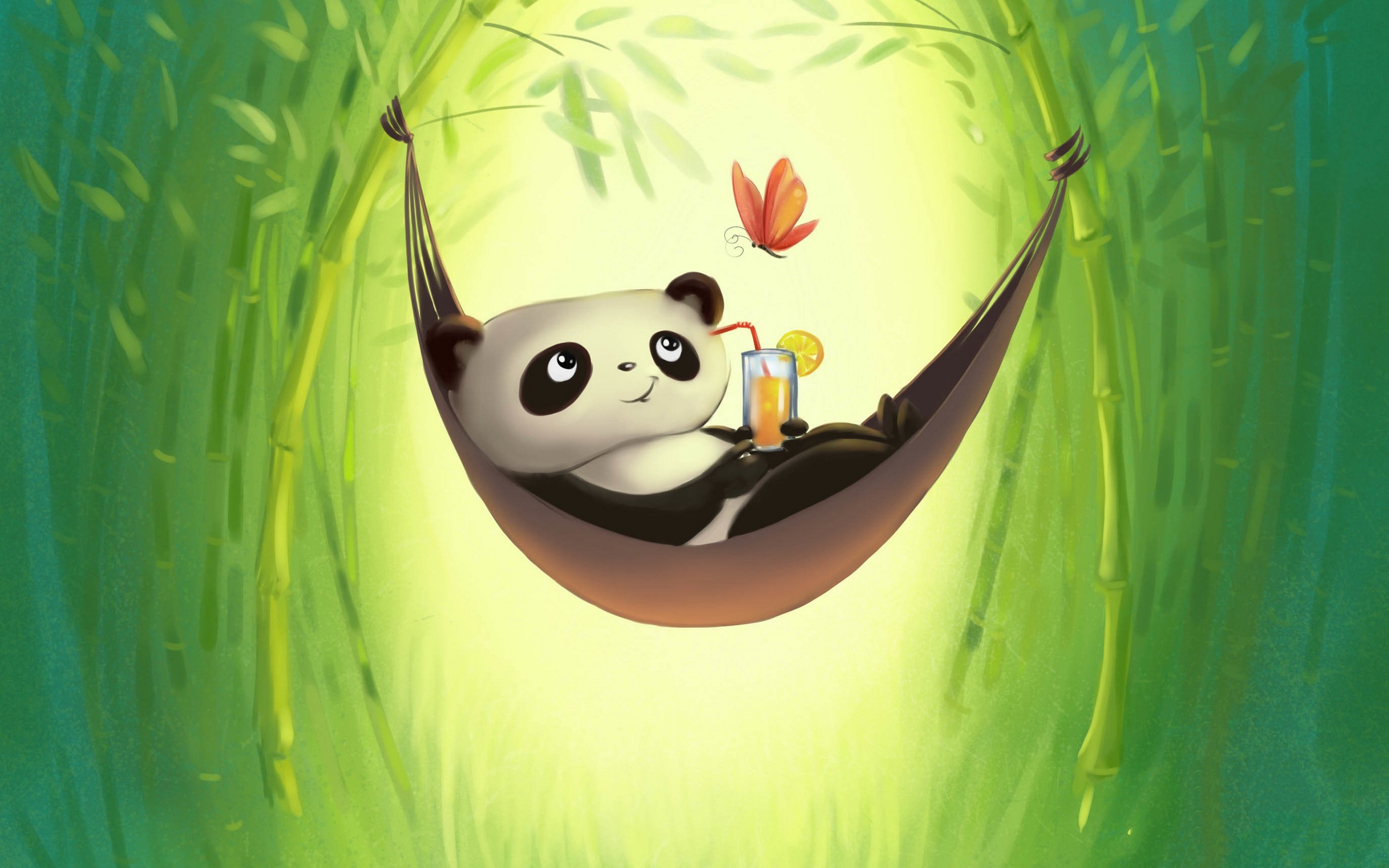 Description: A panda bear is sitting in a hammock with a beer in it's mouth and a butterfly flying above.