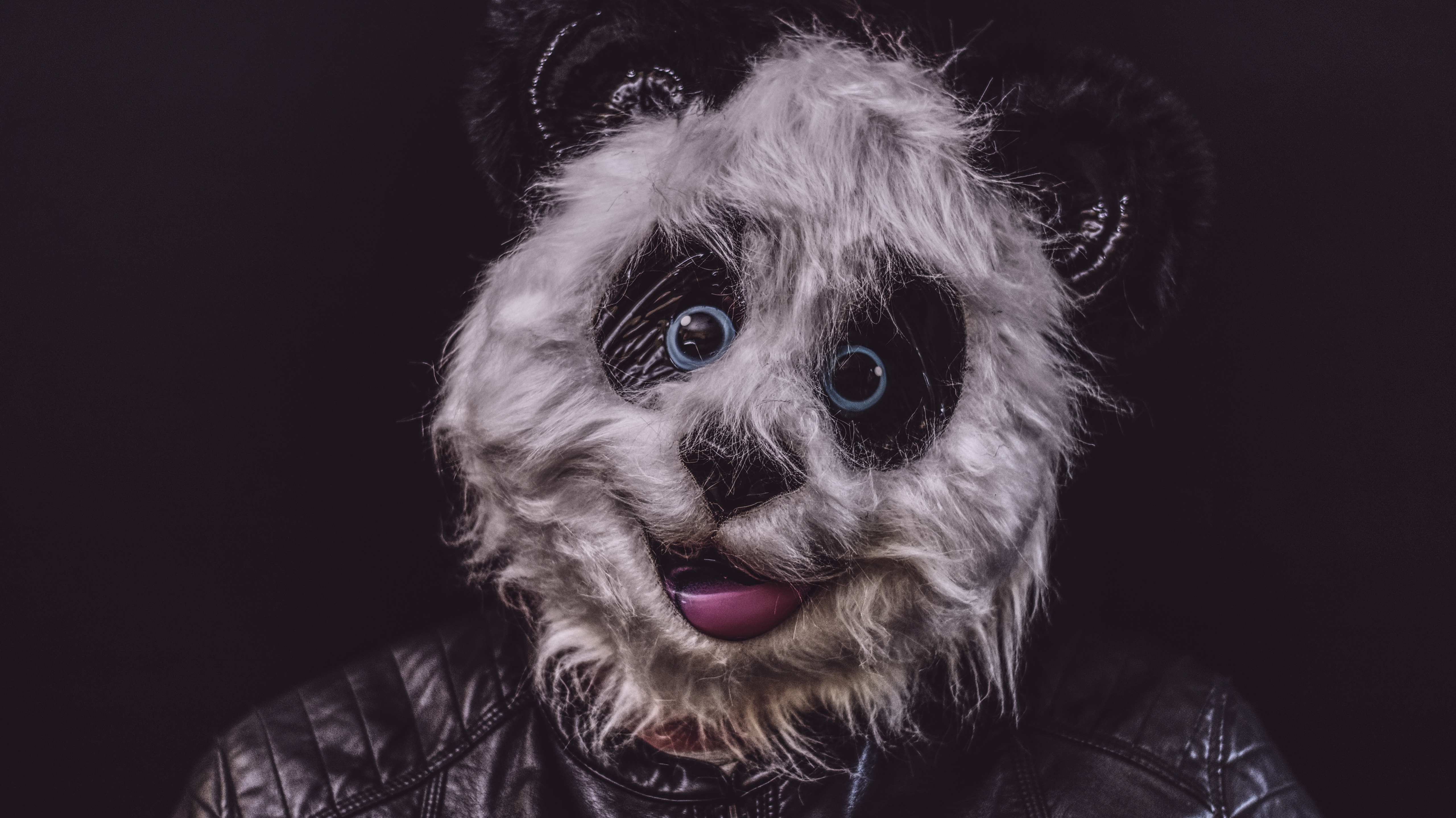 Description: A panda bear wearing a leather jacket and a leather jacket with a fur collar and tongue sticking out.