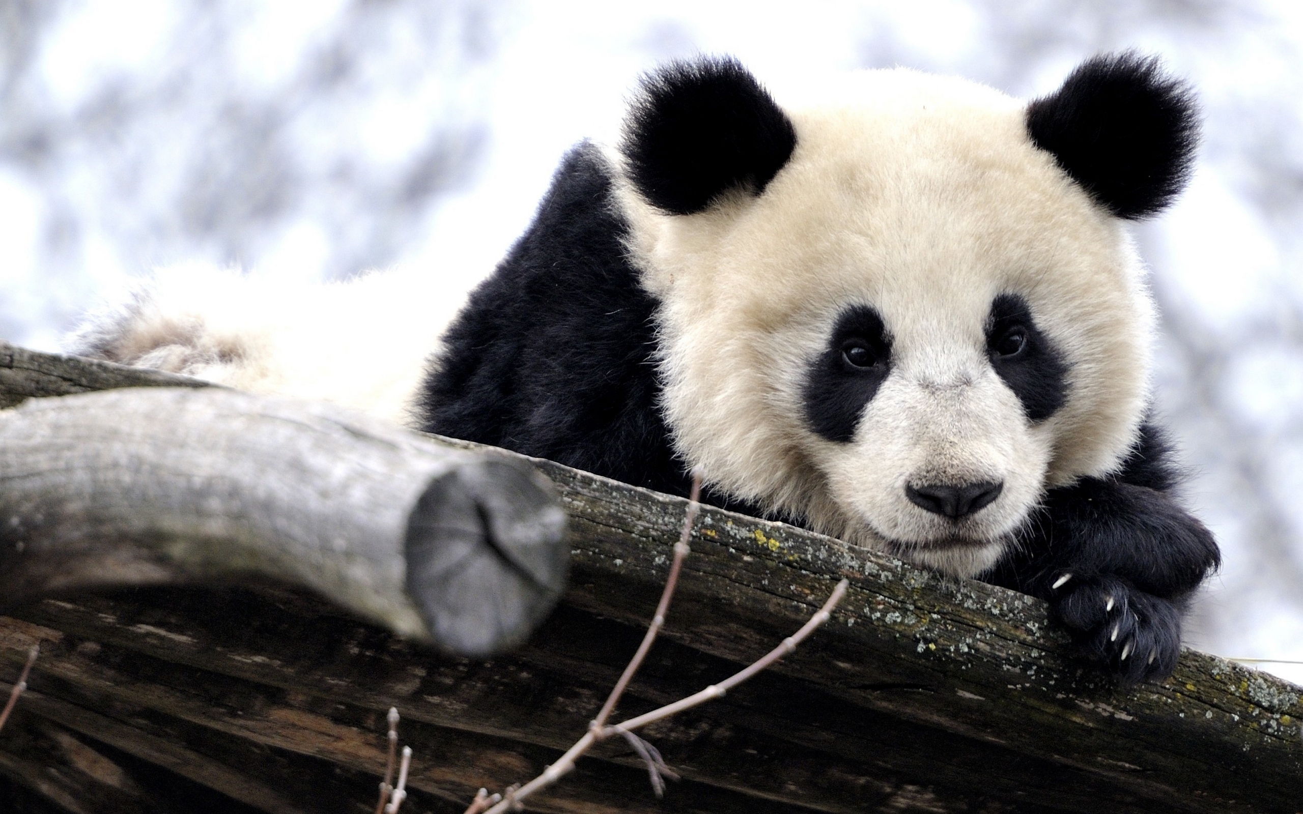 Description: A panda bear is sitting on a tree branch and looking at the camera with a sad look on his face.